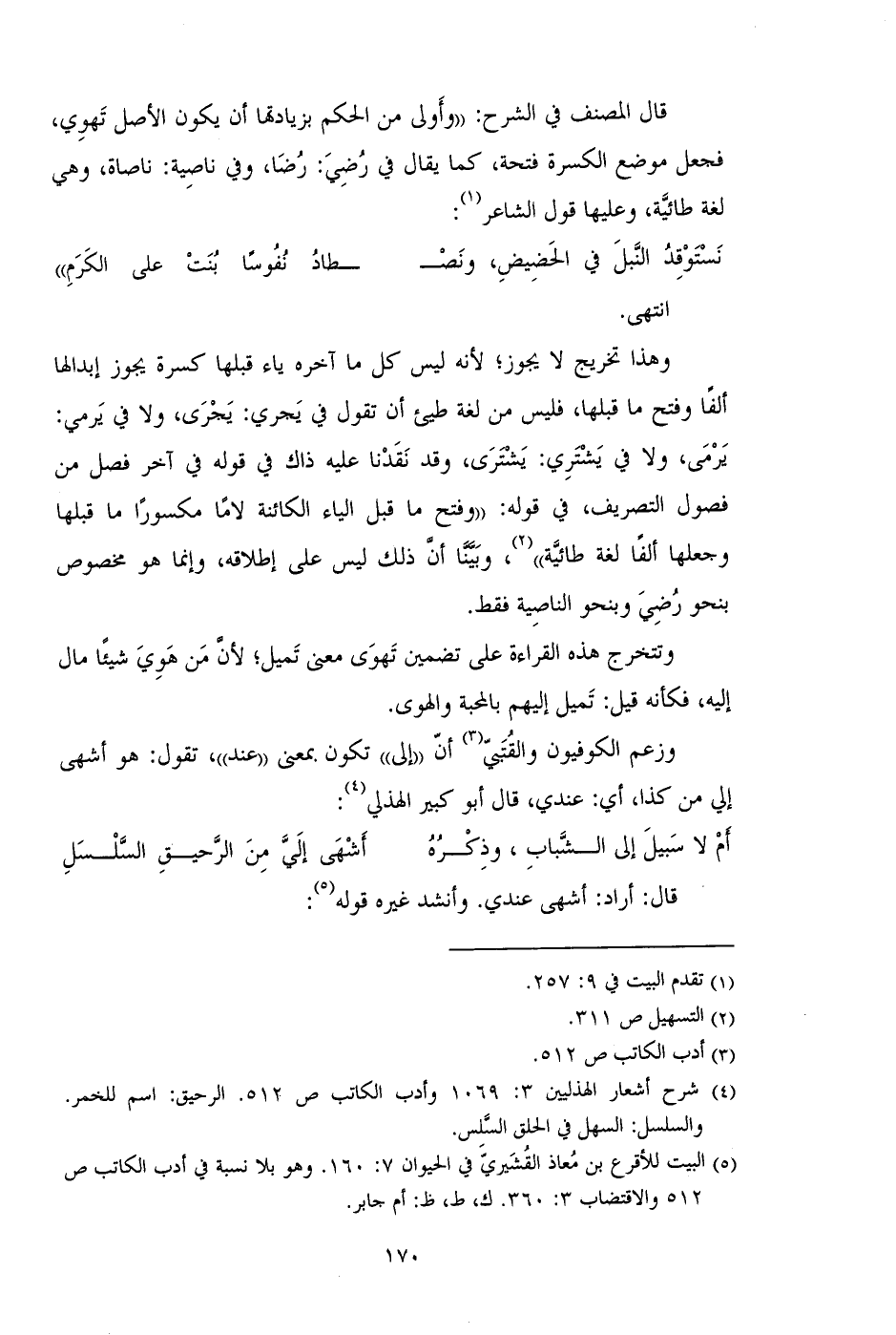 قال المصنف في الشرح: "وأولى من الحكم بزيادتها أن يكون الأصل تهوي، فجعل موضع الكسرة فتحة، كما يقال في رضي: رضا، وفي ناصية: ناصاة، وهي لغة طائية، وعليها قول الشاعر:
