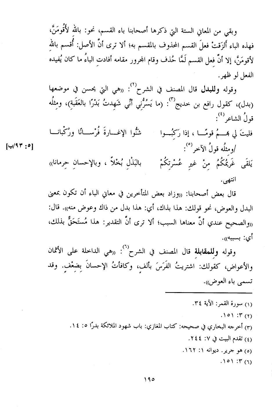 قال بعض أصحابنا: "وزاد بعض المتأخرين في معاني الباء أن تكون بمعنى البدل والعوض، نحو قولك: هذا بذاك، أي: هذا بدل من ذاك وعوض منه". قال: "والصحيح عندي أن معناها السبب؛ ألا ترى أن التقدير: هذا مستحق بذلك، أي: بسببه".
