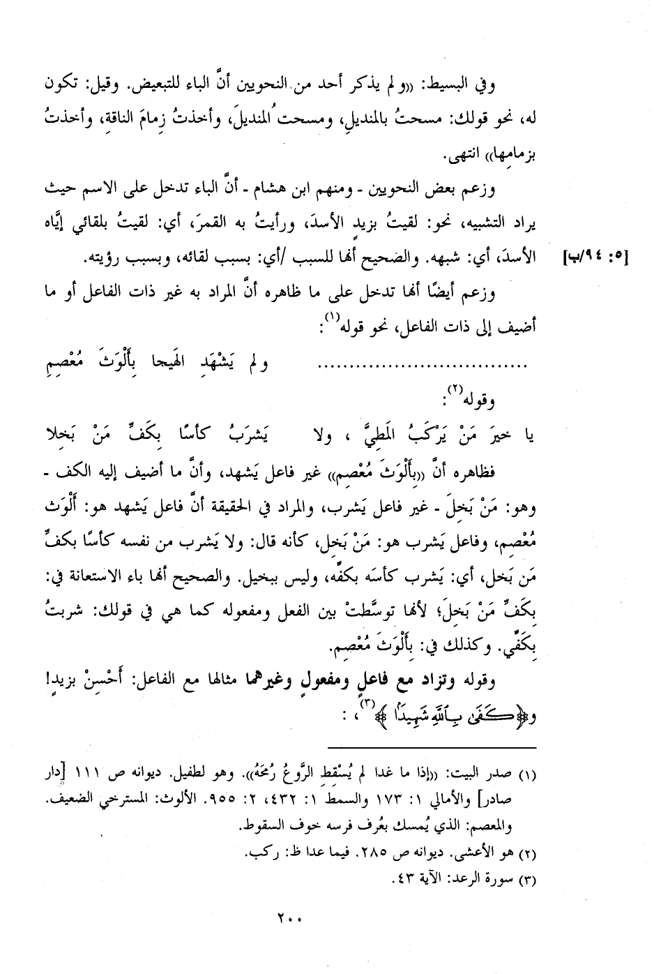 فظاهره أن "بألوث معصم" غير فاعل يشهد، وأن ما أضيف إليه الكف - وهو: من بخل - غير فاعل يشرب، والمراد في الحقيقة أن فاعل يشهد هو: ألوث معصم، وفاعل يشرب هو: من بخل، كأنه قال: ولا يشرب من نفسه كأساً بكف من بخل، أي: يشرب كأسه بكفه، وليس ببخيل. والصحيح أنها باء الاستعانة في: بكف من بخل؛ لأنها توسطت بين لفعل ومفعوله كما هي في قولك: شربت بكفي. وكذلك في: بألوث معصم.