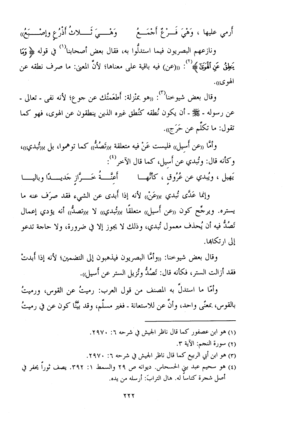 ونازعهم البصريون فيما استدلوا به، فقال بعض أصحابنا في قوله: {وَمَا يَنْطِقُ عَنِ الْهَوَى} "عن فيه باقية على معناها؛ لأن المعنى: ما صرف نطقه عن الهوى".