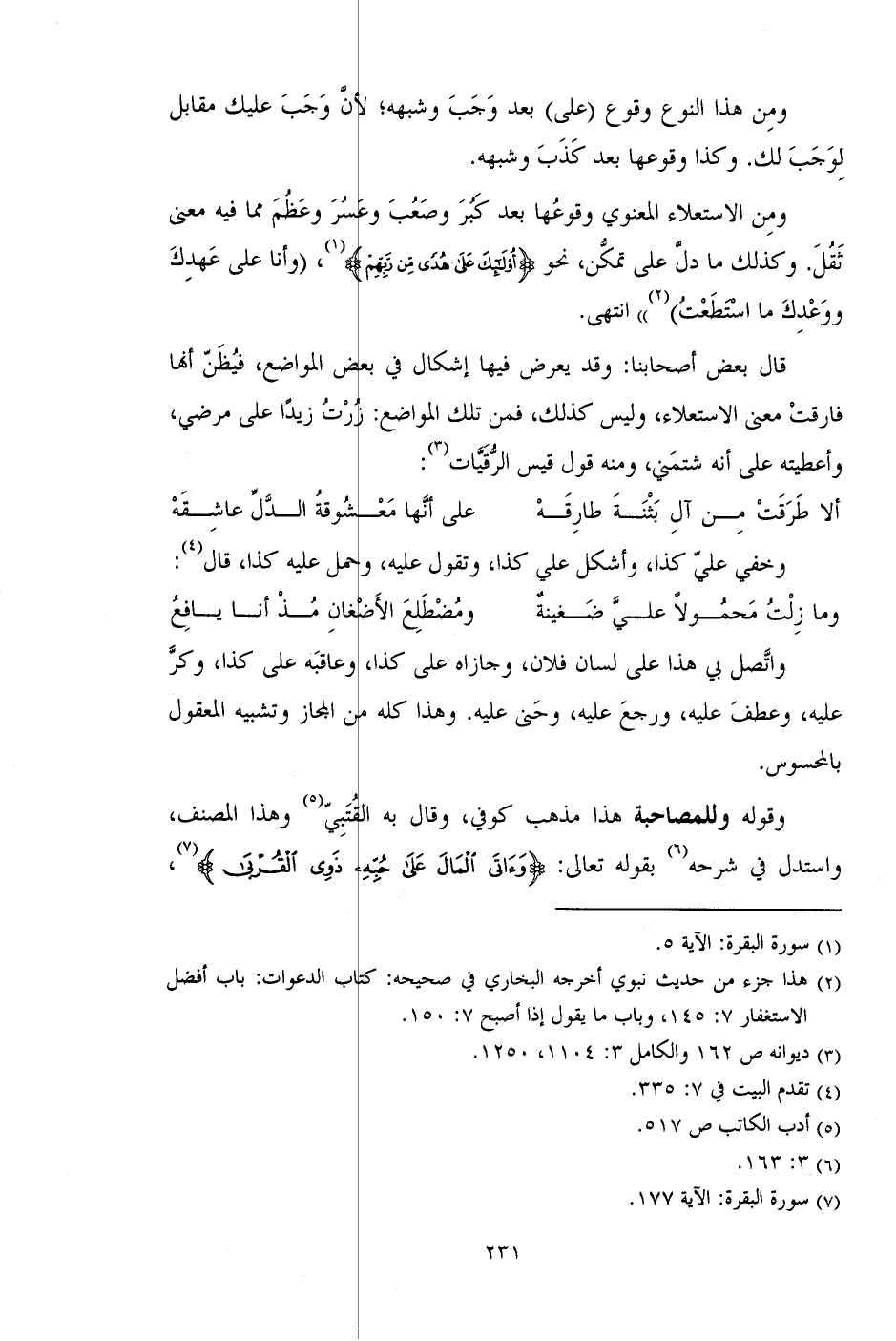 قال بعض أصحابنا: وقد يعرض فيها إشكال في بعض المواضع، فيظن أنها فارقت معنى الاستعلاء وليس كذلك، فمن تلك المواضع: زوت زيدا على مرضي، وأعطيته على أنه شتمني، ومنه قول فيس الرقيات: