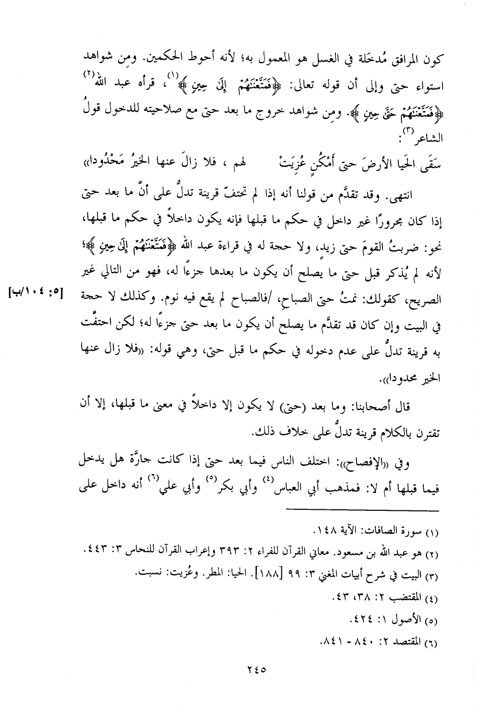 كون المرافق مدخلة في الغسل هو المعمول به؛ لأنه أحوط الحكمين. ومن شواهد استواء حتى وإلى أن قوله تعالى: {فَمَتَّعْنَاهُمْ إِلَى حِينٍ}، قرأه عبد الله {فَمَتَّعْنَاهُمْ إِلَى حِينٍ} ومن شواهد خروج ما بعد حتى مع صلاحيته للدخول قول الشاعر: