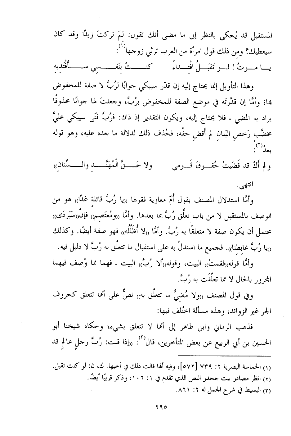 وأما استدلال المصنف بقول أم معاوية فقولها "يارب قائلة غدا" هو من الوصف بالمستقبل لا من باب تعلق رب. بما بعدها. وأما "ومعتصم" فإن "سيردي" محتمل أن يكون صفة لا متعلقا به رب. وأما "لا أظله" فهو صفة أيضا. وكذلك "يارب غابطنا". فجميع ما استدل به على استقبال ما تتعلق به رب لا دليل فيه.