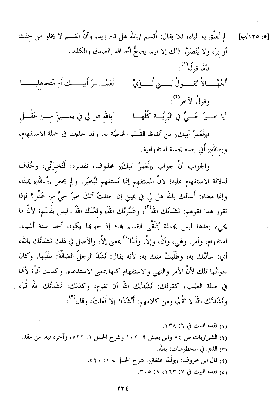 والجواب أن جواب ((لعمر أبيك)) محذوف، تقديره: لتخبرني، وحذف لدلالة الاستفهام عليه؛ لأن المستفهم إنما يستفهم ليخبر. ولم يجعل ((أبالله)) يمينا، وإنما معناه: أسألك بالله هل لي في يميني إن حلفت أنك خير حي من عقل؟ فإذا تقرر هذا فقولهم: نشدتك الله، وعمرتك الله، وقعدك الله_ ليس بقسم؛ لأن ما استفهام، وأمر، ونهي، وأن، وإلا، ولما بمعنى إلا، والأصل في ذلك نشدتك بالله، إي: سألتك به، وطلبت منك به، لأنه يقال نشد الرجل الضالة: طلبها. وكان جوابها تلك لأن الأمر والنهي والاستفهام كلها بمعنى الاستدعاء. وكذلك أن؛ لأنها في صلة الطلب، كقولك: نشدتك الله أن تقوم، وكذلك: نشدتك الله قم، ونشدتك الله لا تقم، ومن كلامهم: أنشدك إلا فعلت، وقال: