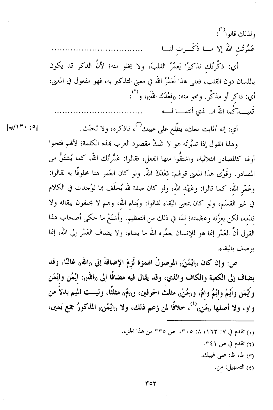 وهذا القول إذا تدبرته هو لا شك مقصود العرب بهذه الكلمة؛ لأنهم فتحوا أولها كالمصادر الثلاثية، واشتقوا منها الفعل، فقالوا: عمرتك الله، كما يشتق من المصادر. وقوى هذا المعنى قولهم: قعدك الله. ولو كان العمر هنا محلوفا به لقالوا: وعمر الله، كما قالو: وعهد الله، ولو كان صفة الله يحلف بها لوجدت في الكلام في غير القسم، ولو كان بمعنى البقاء لقالوا: وبقاء الله، وهم لا يحلفون ببقائه ولا قدمه، لكن بعزته وعظمته؛ لما في ذلك من التعظيم. وأشنع ما حكى أصحاب هذا القول أن العمر إنما هو للإنسان يعمره الله ما يشاء، ولا يضاف العمر إلى الله، إنما يوصف بالبقاء.