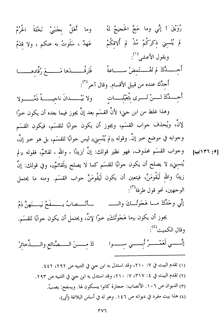 وهذا غلط من ابن جني؛ لأن القسم بعد إن يجوز فيما بعده أن يكون خبرا لأن، ويحذف جواب القسم، ويجوز أن يكون جوابا للقسم، فيكون القسم وجوابه في موضع خبر إن. وقوله ((لم ينسني)) ليس جوابا للقسم، بل هو خبر إن، وجواب القسم محذوف، فهو نظير قولك: إن /زيدا_ والله_ لقائم، فقوله ((لم ينسني)) لا يصلح أن يكون جوابا للقسم كما لا يصلح ((لقائم))، وفي قولك: إن زيدا والله ليقومن، فيتعين أن يكون ليقومن جواب القسم. ومنه ما يحتمل الوجهين، نحو قول طرفة: