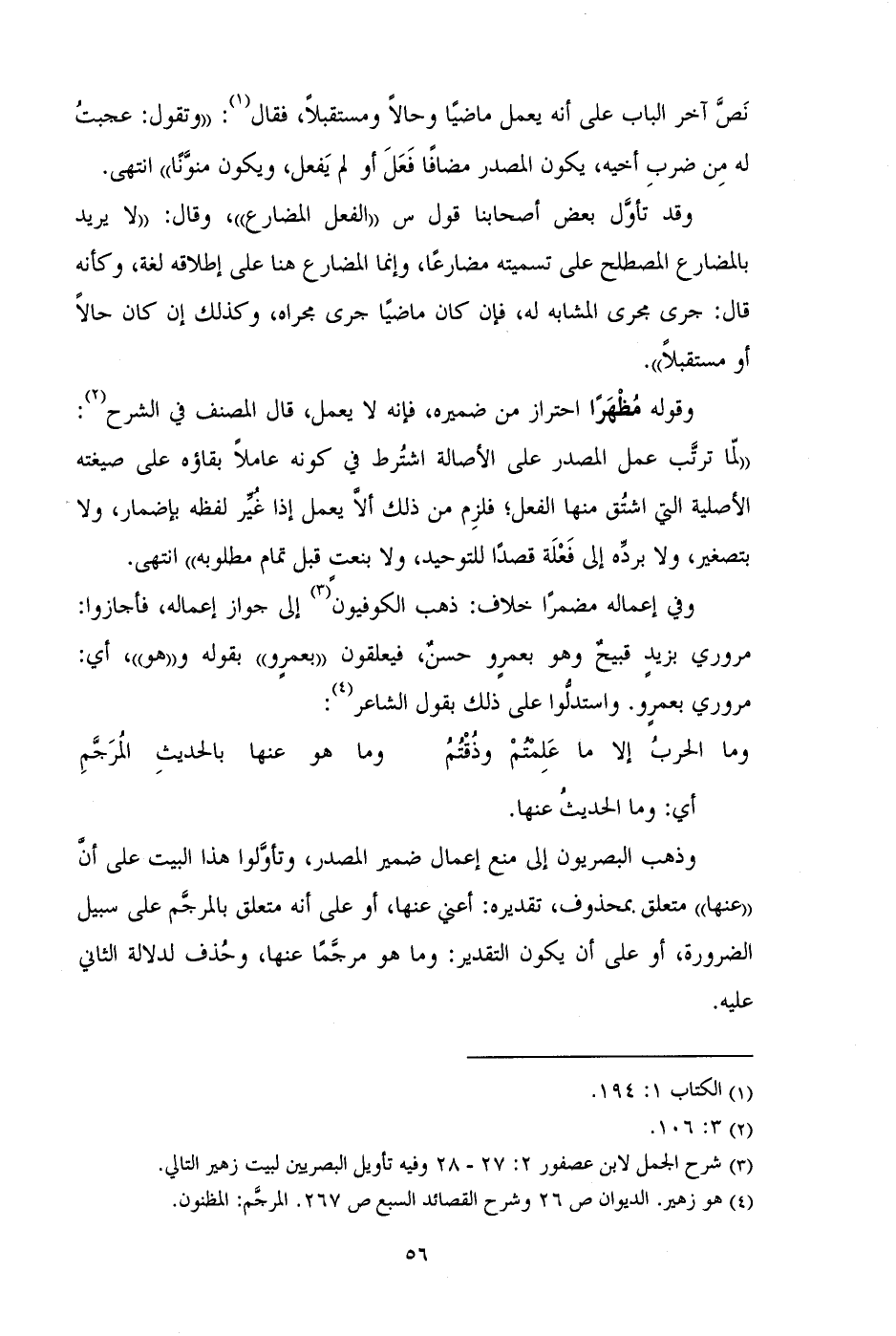 وذهب البصريون إلى منع إعمال ضمير المصدر، وتأولوا هذا البيت على أن "عنها" متعلق بمحذوف، تقديره: أعني عنها، أو على أنه متعلق بالمرجم على سبيل الضرورة، أو على أن يكون التقدير: وما هو مرجماً عنها، وحذف لدلالة الثاني عليه.