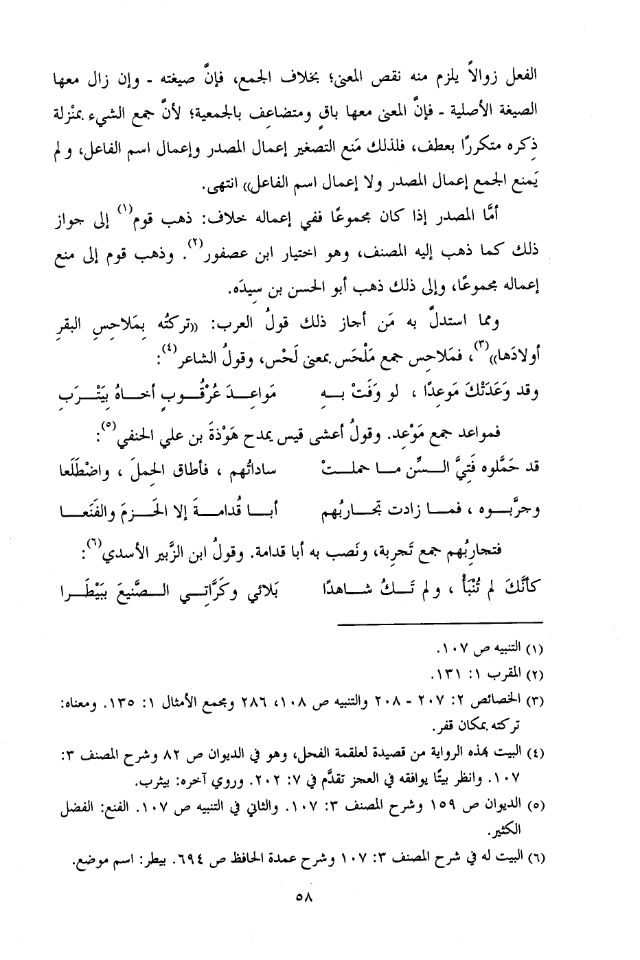 الفعل زوالاً يلزم منه نقص المعنى؛ بخلاف الجمع، فإن صيغته - وإن زال معها الصيغة الأصلية - فإن المعنى معها باق ومتضاعف بالجمعية؛ لأن جمع الشيء بمنزلة ذكره متكرراً بعطف، فلذلك منع التصغير إعمال المصدر وإعمال اسم الفاعل، ولم يمنع الجمع إعمال المصدر ولا إعمال اسم الفاعل" انتهى.