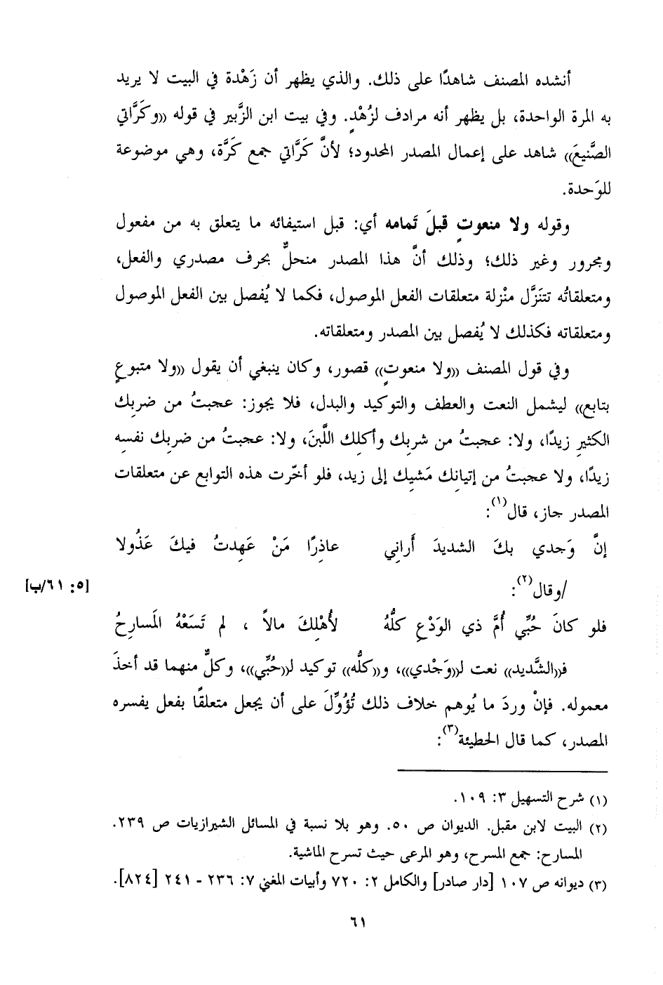 وقوله ولا منعوت قبل تمامه أي: قبل استيفائه ما يتعلق به من مفعول مجرور وغير ذلك؛ وذلك أن هذا المصدر منحل بحرف مصدري والفعل، ومتعلقاته تتنزل منزلة متعلقات الفعل الموصول، فكما لا يفصل بين الفعل الموصول ومتعلقاته فكذلك لا يفصل بين المصدر ومتعلقاته.