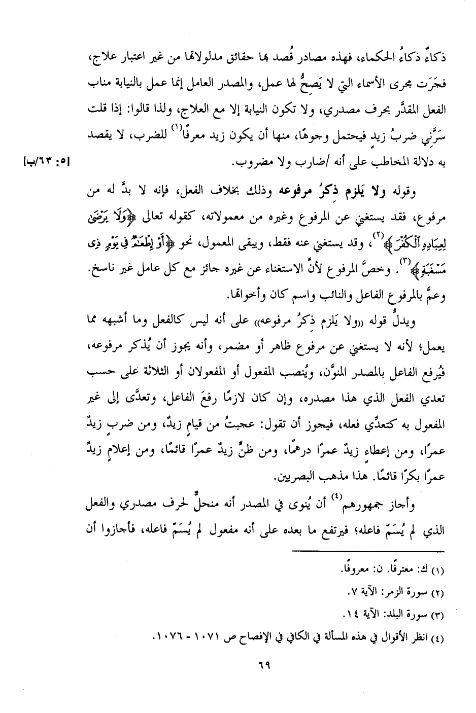 ذكاء ذكاء الحكماء، فهذه مصادر قصد بها حقائق مدلولاتها من غير اعتبار علاج، فجرت مجرى الأسماء التي لا يصح لها عمل، والمصدر العامل إنما عمل بالنيابة مناب الفعل المقدر بحرف مصدري، ولا تكون النيابة إلا مع العلاج، ولذا قالوا: إذا قلت سرني ضرب زيد فيحتمل وجوهاً، منها أن يكون زيد معرفاً للضرب، لا يقصد به دلالة المخاطب على أنه/ ضارب ولا مضروب. [5: 63/ب]
