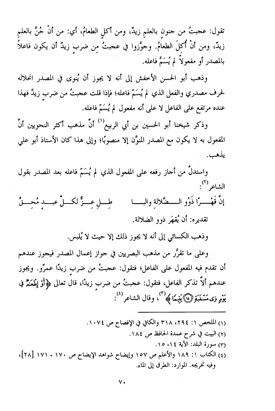 وعلى ما تقرر من مذهب البصريين في جواز إعمال المصدر فيجوز عندهم أن تقدم فيه المفعول على الفاعل؛ فتقول: عجبت من ضرب زيداً عمرو. ويجوز عندهم ألا تذكر الفاعل، فتقول: عجبت من ضرب زيداً، قال تعالى (أَوْ إِطْعَامٌ فِي يَوْمٍ ذِي مَسْغَبَةٍ (14) يَتِيمًا)، وقال الشاعر: