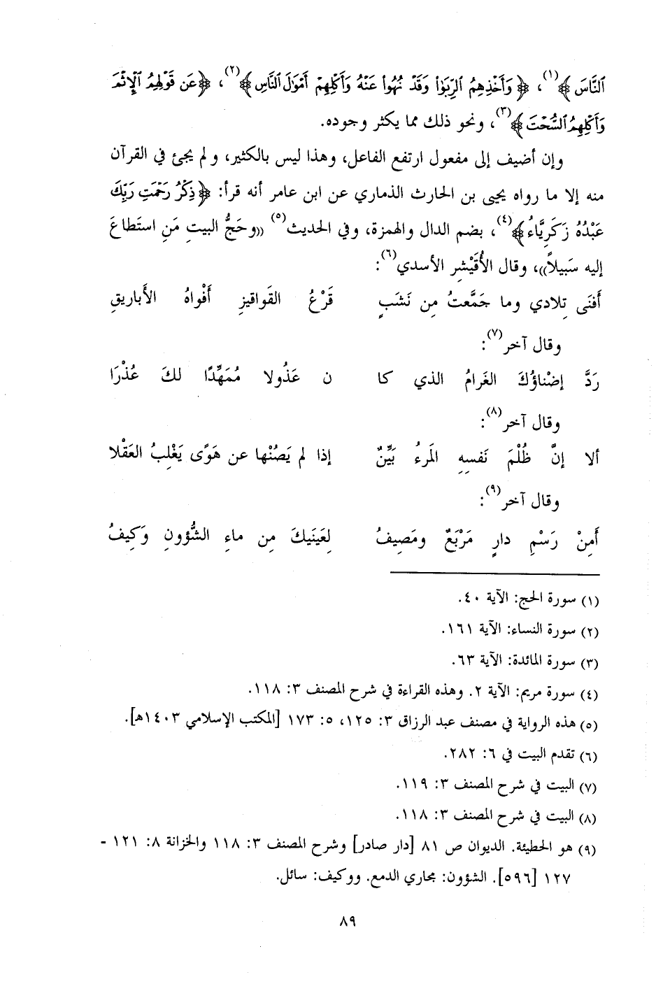 وإن أضيف إلى مفعول ارتفع الفاعل، وهذا ليس بالكثير، ولم يجيء في القرآن منه إلا ما رواه يحيى بن الحارث الذماري عن ابن عامر أنه قرأ: (ذِكْرُ رَحْمَةِ رَبِّكَ عَبْدَهُ زَكَرِيَّا)، بضم الدال والهمزة، وفي الحديث "وحج البيت من استطاع إليه سبيلاً"، وقال الأقيشر الأسدي: