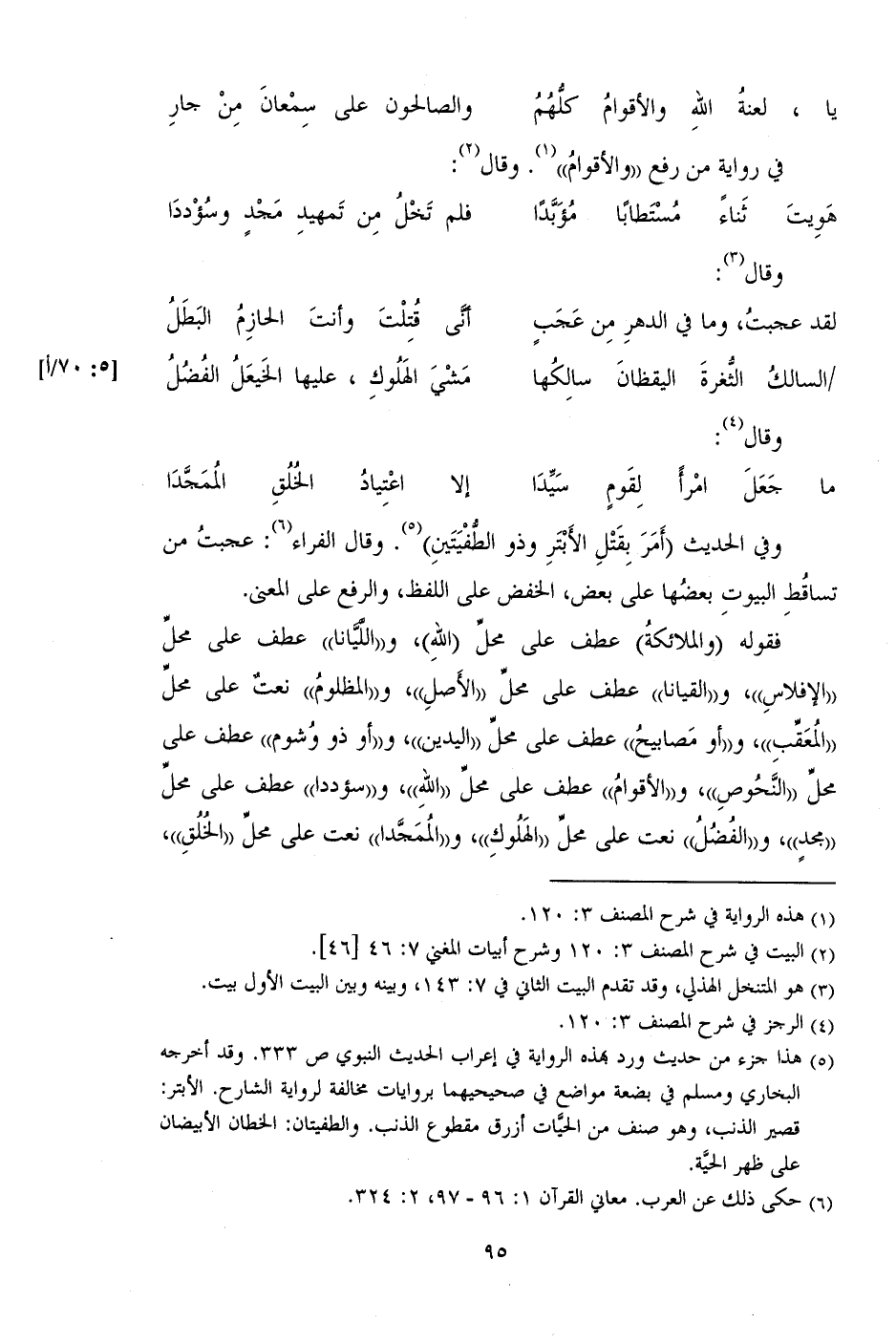 فقوله (والملائكة) عطف على محل (الله)، و"الليانا" عطف على محل "الإفلاس"، و"القيانا" عطف على محل "الأصل"، و"المظلوم" نعت على محل "المعقب"، و"أو مصابيح" عطف على محل "اليدين"، و"أو ذو وشوم" عطف على محل "النحوص"، و"الأقوام" عطف على محل "الله"، و"سؤددا" عطف على محل "مجد"، و"الفضل" نعت على محل "الهلوك"، و"الممجدا" نعت على محل "الخلق"،