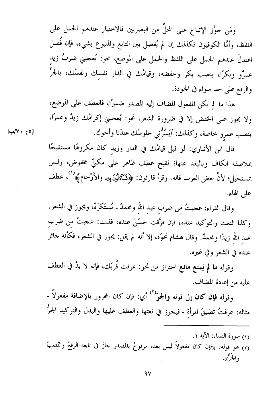 قال ابن الأنباري: لو قيل قيامك في الدار وزيد كان مكروهاً مستقبحاً بملاصقة الكاف وبالبعد عنها؛ لقبح عطف ظاهر على مكني مخفوض، وليس بمستحيل؛ لأن بعض العرب قاله. وقرأ قارئون: (تَسَاءَلُونَ بِهِ وَالْأَرْحَامَ)، عطف على الهاء.