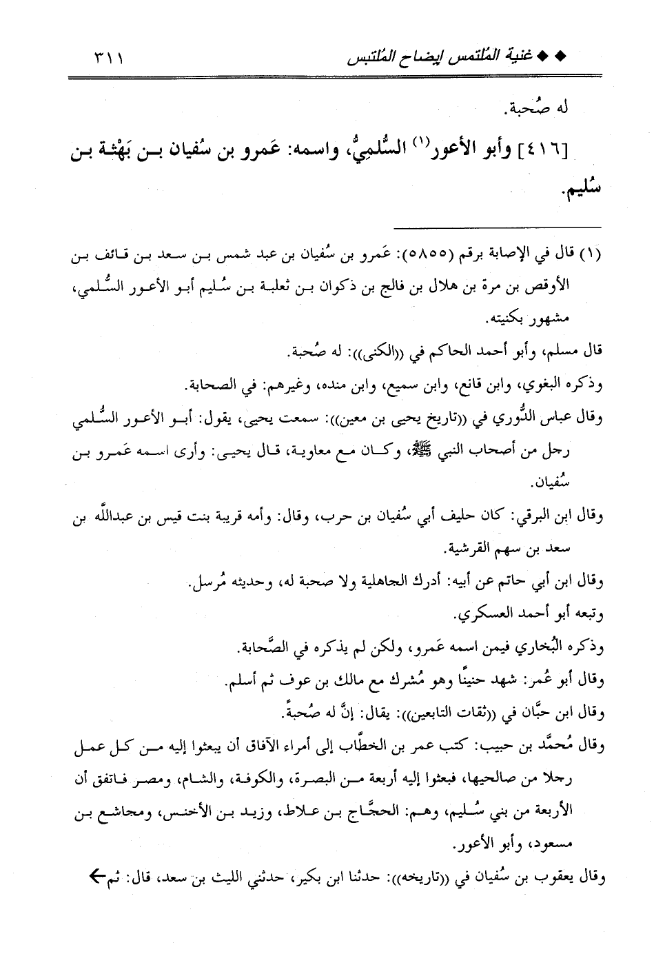 [416] وَأَبُو الْأَعْوَر السّلمِيّ، واسْمه: عَمْرو بن سُفْيَان بن بهثة بن سليم.