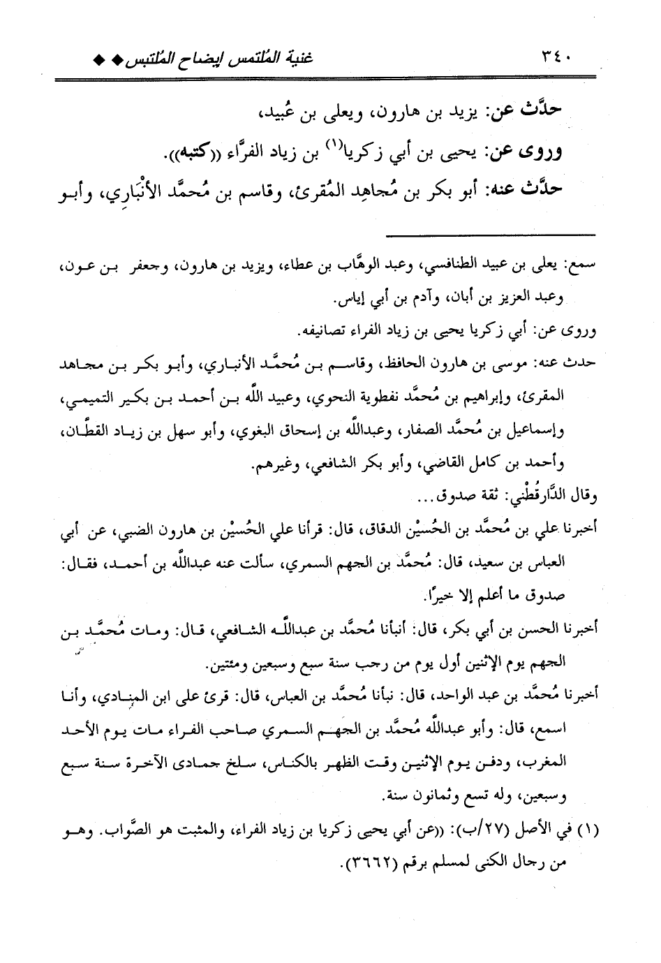 وروى عَن: يحيى بن أبي زَكَرِيَّا بن زِيَاد الْفراء ((كتبه)) .