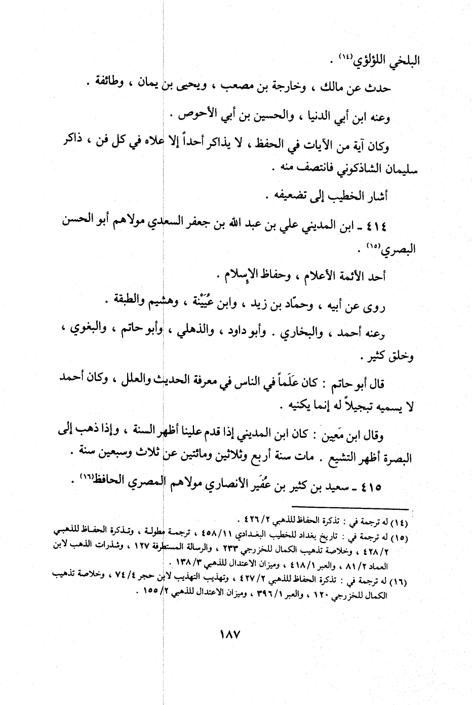 414 - ابْن الْمَدِينِيّ عَليّ بن عبد الله بن جَعْفَر السَّعْدِيّ مَوْلَاهُم أَبُو الْحسن الْبَصْرِيّ