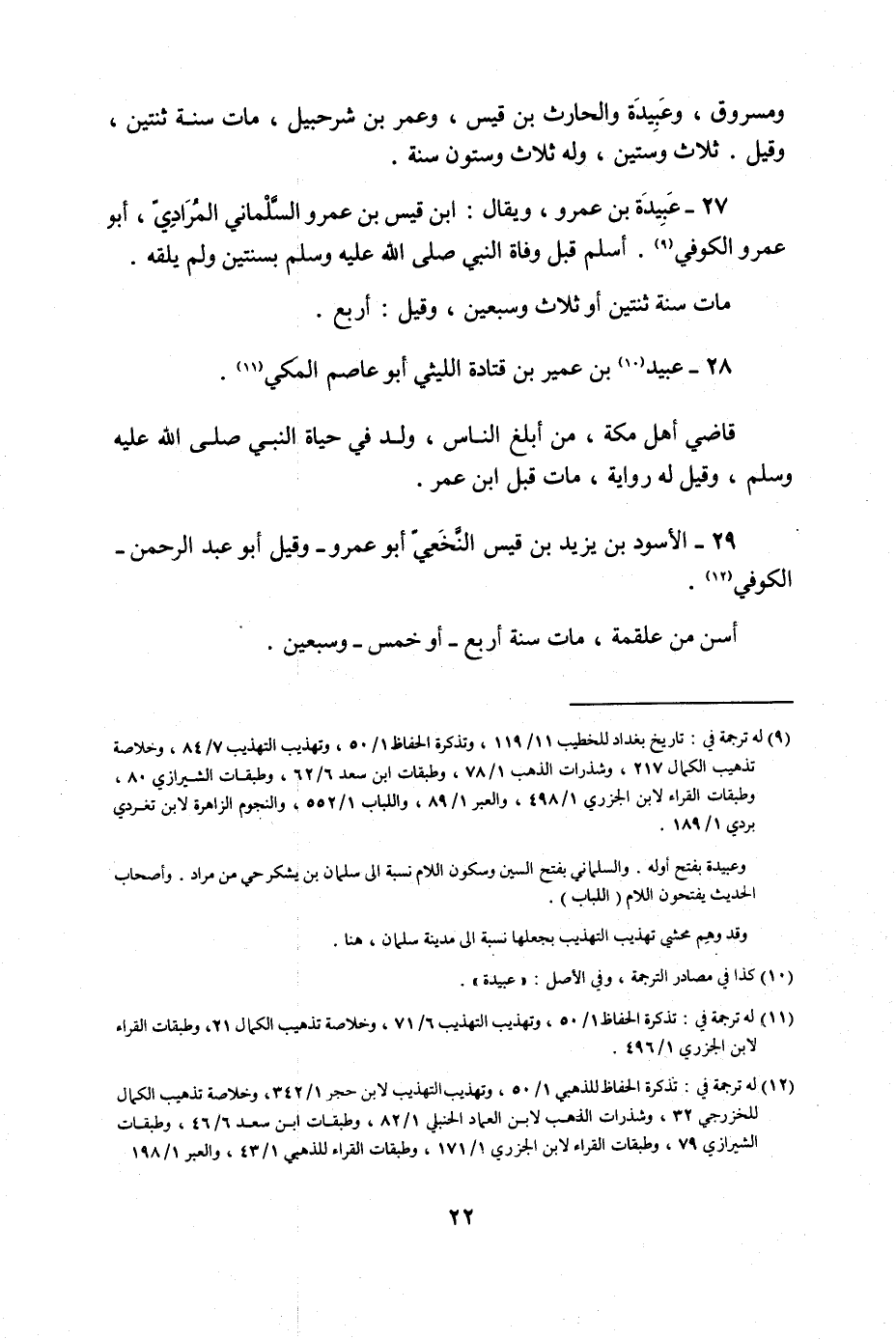 27 - عُبَيْدَة بن عَمْرو وَيُقَال ابْن قيس بن عَمْرو السَّلمَانِي الْمرَادِي أَبُو عَمْرو الْكُوفِي أسلم قبل وَفَاة النَّبِي صلى الله عَلَيْهِ وَسلم بِسنتَيْنِ وَلم يلقه