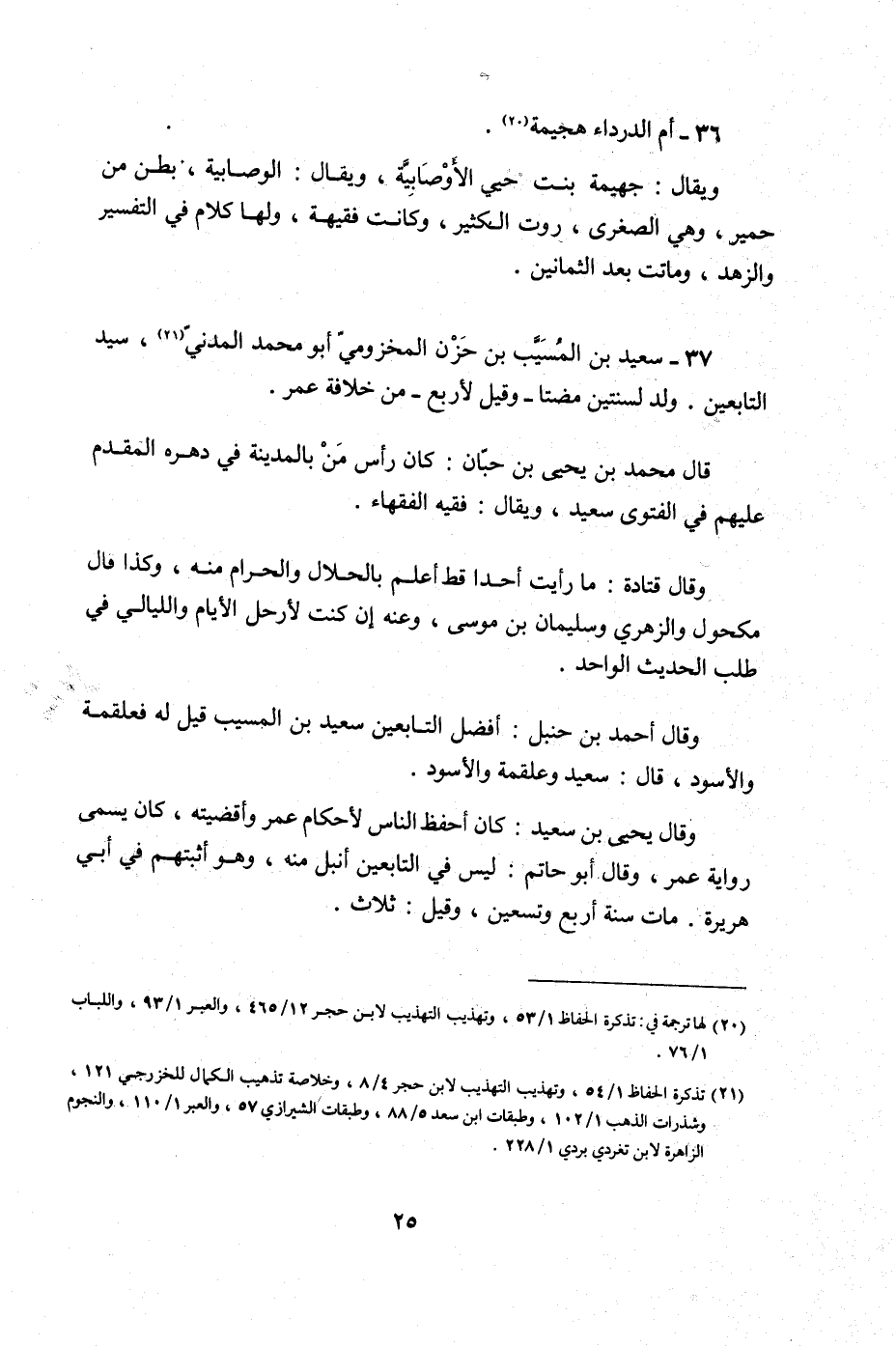37 - سعيد بن الْمسيب بن حزن المَخْزُومِي أَبُو مُحَمَّد الْمدنِي سيد التَّابِعين ولد لِسنتَيْنِ مضتا وَقيل لأَرْبَع من خلَافَة عمر