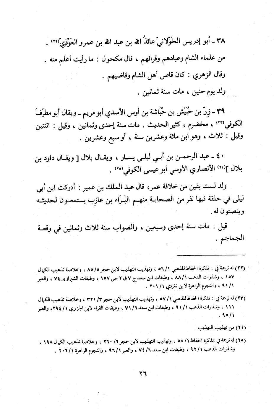 39 - زر بن حُبَيْش بن حُبَاشَة بن أَوْس الْأَسدي أَبُو مَرْيَم وَيُقَال أَبُو مطرف الْكُوفِي مخضرم كثير الحَدِيث مَاتَ سنة إِحْدَى وَثَمَانِينَ وَقيل اثْنَتَيْنِ وَقيل ثَلَاث وَهُوَ ابْن مائَة وَعشْرين سنة أَو سبع وَعشْرين