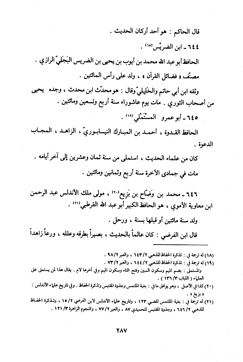 646 - مُحَمَّد بن وضاح بن بزيع مولى ملك الأندلس عبد الرَّحْمَن ابْن مُعَاوِيَة الْأمَوِي هُوَ الْحَافِظ الْكَبِير أَبُو عبد الله الْقُرْطُبِيّ