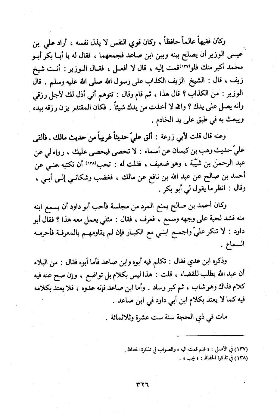 وَكَأن فَقِيها عَالما حَافِظًا وَكَانَ قوي النَّفس لَا يذل نَفسه أَرَادَ عَليّ بن عِيسَى الْوَزير أَن يصلح بَينه وَبَين ابْن صاعد فجمعهما فَقَالَ لَهُ يَا أَبَا بكر أَبُو مُحَمَّد أكبر مِنْك فَلَو قُمْت إِلَيْهِ قَالَ لَا أفعل فَقَالَ الْوَزير أَنْت شيخ زيف قَالَ الشَّيْخ الزيف الْكذَّاب على رَسُول الله صلى الله عَلَيْهِ وَسلم قَالَ الْوَزير من الْكذَّاب قَالَ هَذَا ثمَّ قَامَ وَقَالَ تتوهم أبي أذلّ لَك لأجل رِزْقِي وَأَنه يصل على يدك وَالله لَا أخذت من يدك شَيْئا فَكَانَ المقتدر يزن رزقه بِيَدِهِ وَيبْعَث بِهِ فِي طبق على يَد الْخَادِم