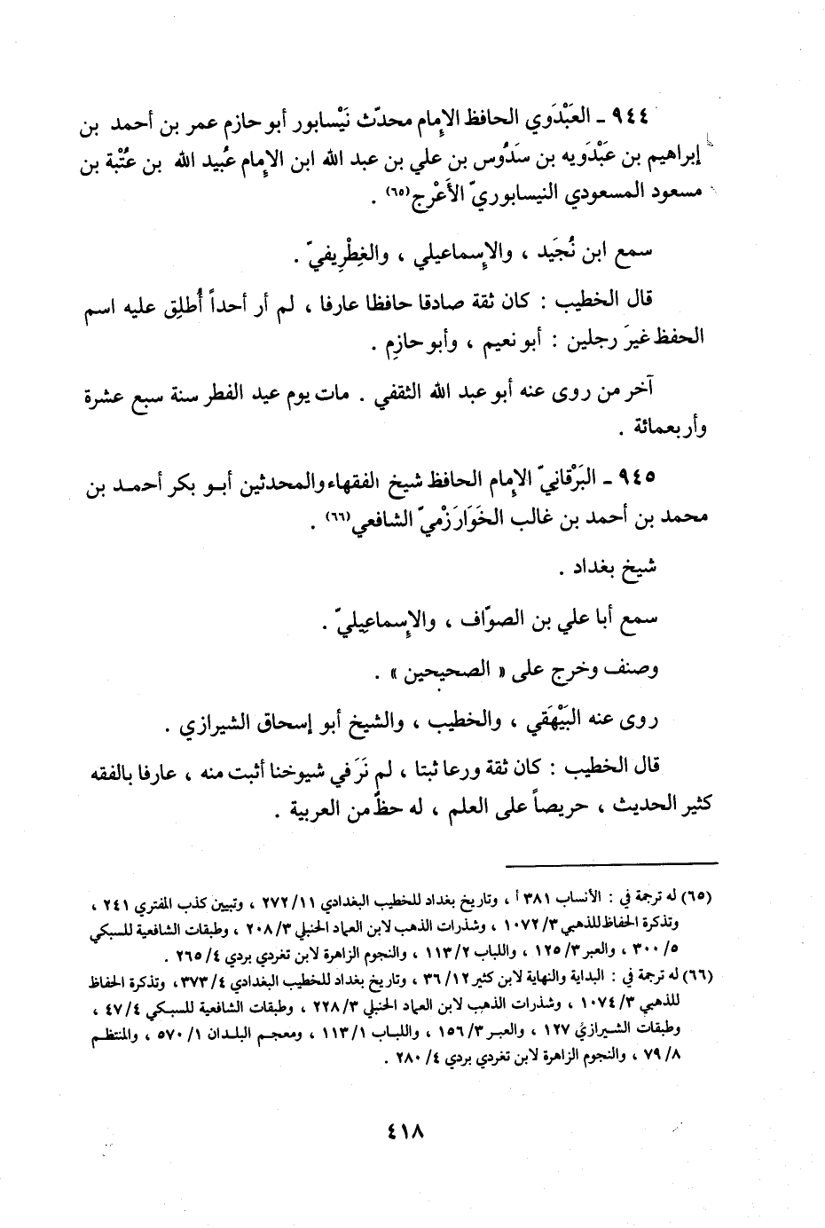 945 - البرقاني الإِمَام الْحَافِظ شيخ الْفُقَهَاء والمحدثين أَبُو بكر أَحْمد بن مُحَمَّد بن أَحْمد بن غَالب الْخَوَارِزْمِيّ الشَّافِعِي