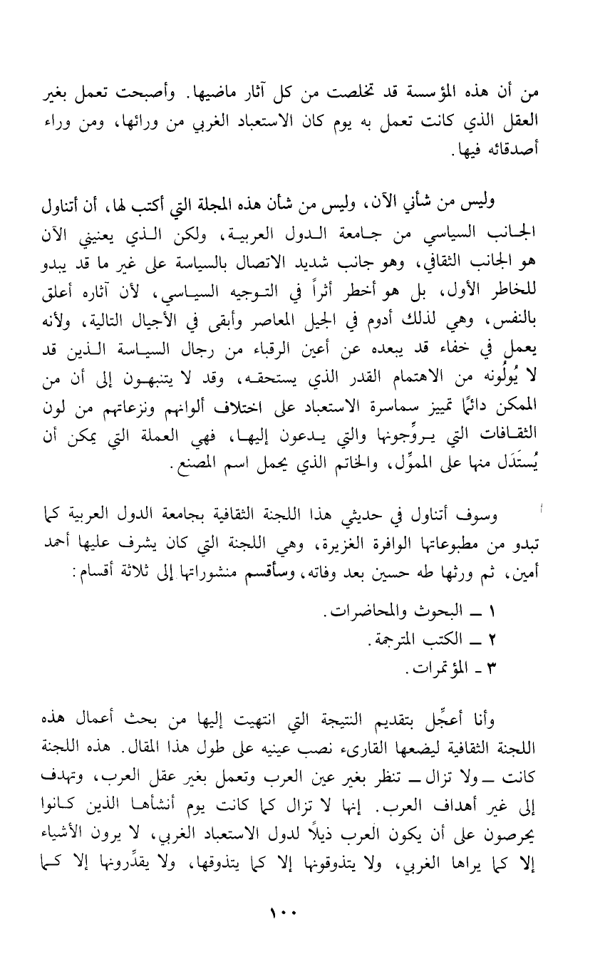وأنا أعجِّل بتقديم النتيجة التي انتهيت إليها من بحث أعمال هذه اللجنة الثقافية ليضعها القارئ نصب عينيه على طول هذا المقال. هذه اللجنة كانت - ولا تزال - تنظر بغير عين العرب وتعمل بغير عقل العرب، وتهدف إلى غير أهداف العرب. إنها لا تزال كما كانت يوم أنشأها الذين كانوا يحرصون على أن يكون العرب ذيلًا لدول الاستعباد الغربي، لا يرون الأشياء إلا كما يراها الغربي، ولا يتذوقونها إلا كما يتذوقها, ولا يقدِّرونها إلا كما