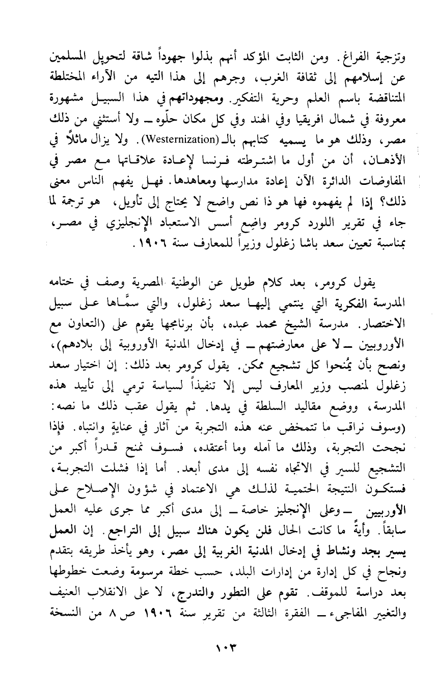 وتزجية الفراغ. ومن الثابت المؤكد أنهم بذلوا جهوداً شاقة لتحويل المسلمين عن إسلامهم إلى ثقافة الغرب، وجرهم إلى هذا التيه من الآراء المختلطة المتناقضة باسم العلم وحرية التفكير. ومجهوداتهم في هذا السبيل مشهورة معروفة في شمال افريقيا وفي الهند وفي كل مكان حلّوه - ولا أستثني من ذلك مصر، وذلك هو ما يسميه كتابهم بالـ (Westernization). ولا يزال ماثلاً في الأذهان، أن من أول ما اشترطته فرنسا لإِعادة علاقاتها مع مصر في المفاوضات الدائرة الآن إعادة مدارسها ومعاهدها. فهل يفهم الناس معنى ذلك؟ إذا لم يفهموه فها هو ذا نص واضح لا يحتاج إلى تأويل، هو ترجمة لما جاء في تقرير اللورد كرومر واضِع أسس الاستعباد الإِنجليزي في مصر، بمناسبة تعيين سعد باشا زغلول وزيراً للمعارف سنة 1906.