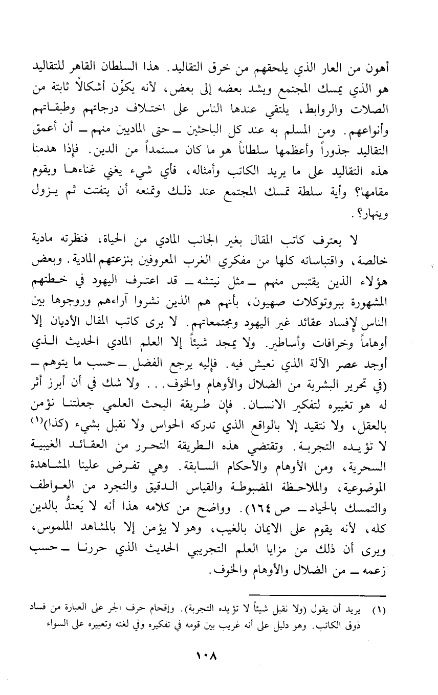 لا يعترف كاتب المقال بغير الجانب المادي من الحياة، فنظرته مادية خالصة، واقتباساته كلها من مفكري الغرب المعروفين بنزعتهم المادية. وبعض هؤلاء الذين يقتبس منهم - مثل نيتشه - قد اعترف اليهود في خطتهم المشهورة ببروتوكلات صهيون، بأنهم هم الذين نشروا آراءهم وروجوها بين الناس لإِفساد عقائد غير اليهود ومجتمعاتهمِ. لا يرى كاتب المقال الأديان إلا أوهاماً وخرافات وأساطير. ولا يمجد شيئاً إلا العلم المادي الحديث الذي أوجد عصر الآلة الذي نعيش فيه. فإِليه يرجع الفضل - حسب ما يتوهم - (في تحرير البشرية من الضلال والأوهام والخوف ... ولا شك في أن أبرز أثر له هو تغييره لتفكير الإنسان. فإِن طريقة البحث العلمي جعلتنا نؤمن بالعقل، ولا نتقيد إلا بالواقع الذي تدركه الحواس ولا نقبل بشيء (كذا) (¬1) لا تؤيده التجربة. وتقتضي هذه الطريقة التحرر من العقائد الغيبية السحرية، ومن الأوهام والأحكام السابقة. وهي تفرض علينا المشاهدة الموضوعية، والملاحظة المضبوطة والقياس الدقيق والتجرد من العواطف والتمسك بالحياد - ص 164). وواضح من كلامه هذا أنه لا يَعتدُّ بالدين كله, لأنه يقوم على الايمان بالغيب، وهو لا يؤمن إلا بالمشاهد الملموس، ويرى أن ذلك من مزايا العلم التجريبي الحديث الذي حررنا - حسب زعمه - من الضلال والأوهام والخوف.