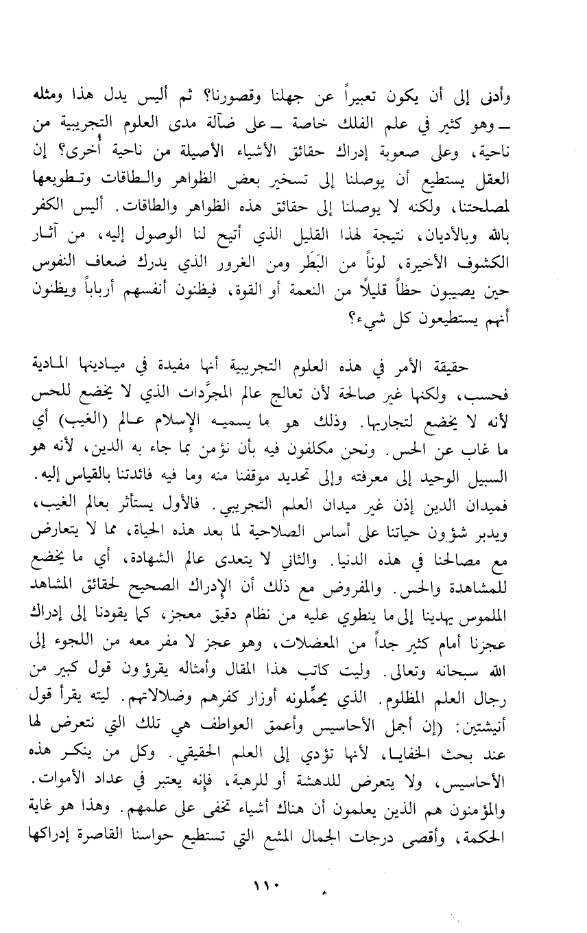 حقيقة الأمر في هذه العلوم التجريبية أنها مفيدة في ميادينها المادية فحسب، ولكنها غير صالحة لأن تعالج عالم المجرَّدات الذي لا يخضع للحس لأنه لا يخضع لتجاربها. وذلك هو ما يسميه الإِسلام عالم (الغيب) أي ما غاب عن الحس. ونحن مكلفون فيه بأن نؤمن بما جاء به الدين, لأنه هو السبيل الوحيد إلى معرفته وإلى تحديد موقفنا منه وما فيه فائدتنا بالقياس إليه. فميدان الدين إذن غير ميدان العلم التجريبي. فالأول يستأثر بعالم الغيب، ويدبر شؤون حياتنا على أساس الصلاحية لما بعد هذه الحياة، مما لا يتعارض مع مصالحنا في هذه الدنيا. والثاني لا يتعدى عالم الشهادة، أي ما يخضع للمشاهدة والحس. والمفروض مع ذلك أن الِإدراك الصحيح لحقائق المشاهد الملموس يهدينا إلى ما ينطوي عليه من نظام دقيق معجز، كما يقودنا إلى إدراك عجزنا أمام كثير جداً من المعضلات، وهو عجز لا مفر معه من اللجوء إلى الله سبحانه وتعالى. وليت كاتب هذا المقال وأمثاله يقرؤون قول كبير من رجال العلم المظلوم. الذي يحمِّلونه أوزار كفرهم وضلالاتهم. ليته يقرأ قول أنيشتين: (إن أجمل الأحاسيس وأعمق العواطف هي تلك التي نتعرض لها عند بحث الخفايا, لأنها تؤدي إلى العلم الحقيقي. وكل من ينكر هذه الأحاسيس، ولا يتعرض للدهشة أو للرهبة، فإِنه يعتبر في عداد الأموات. والمؤمنون هم الذين يعلمون أن هناك أشياء تخفى على علمهم. وهذا هو غاية الحكمة، وأقصى درجات الجمال المشع التي تستطيع حواسنا القاصرة إدراكها