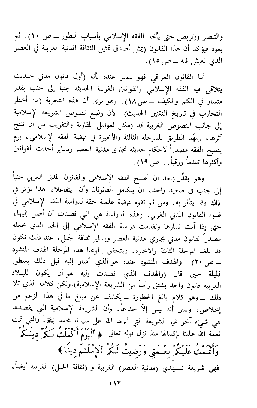 والتبصر (وتربص حتى يأخذ الفقه الإِسلامي بأسباب التطور - ص10). ثم يعود فيؤكد أن هذا القانون (يمثل أصدق تمثيل الثقافة المدنية الغربية في العصر الذي نعيش فيه - ص 15).