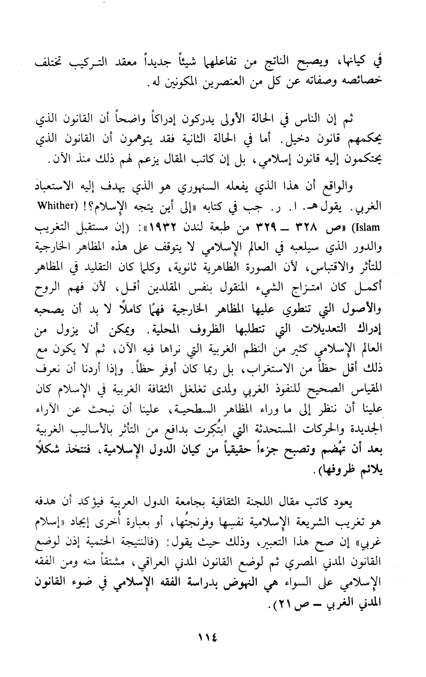 والواقع أن هذا الذي يفعله السنهوري هو الذي يهدف إليه الاستعباد الغربي. يقول هـ. ا. ر. جب في كتابه "إلى أين يتجه الإِسلام؟! (Whither Islam) " ص 328 - 329 من طبعة لندن 1932": (إن مستقبل التغريب والدور الذي سيلعبه في العالم الإِسلامي لا يتوقف على هذه المظاهر الخارجية للتأثر والاقتباس, لأن الصورة الظاهرية ثانوية، وكلما كان التقليد في المظاهر أكمل كان امتزاج الشيء المنقول بنفس المقلدين أقل, لأن فهم الروح والأصول التي تنطوي عليها المظاهر الخارجية فهمًا كاملاً لا بد أن يصحبه إدراك التعديلات التي تتطلبها الظروف المحلية. ويمكن أن يزول من العالم الإِسلامي كثير من النظم الغربية التي نراها فيه الآن، ثم لا يكون مع ذلك أقل حظاً من الاستغراب، بل ربما كان أوفر حظاً. وإذا أردنا أن نعرف المقياس الصحيح للنفوذ الغربي ولمدى تغلغل الثقافة الغربية في الإِسلام كان علينا أن ننظر إلى ما وراء المظاهر السطحية، علينا أن نبحث عن الآراء الجديدة والحركات المستحدثة التي ابتُكِرت بدافع من التأثر بالأساليب الغربية بعد أن تهُضم وتصبح جزءاً حقيقياً من كيان الدول الإِسلامية، فتتخذ شكلاً يلائم ظروفها).