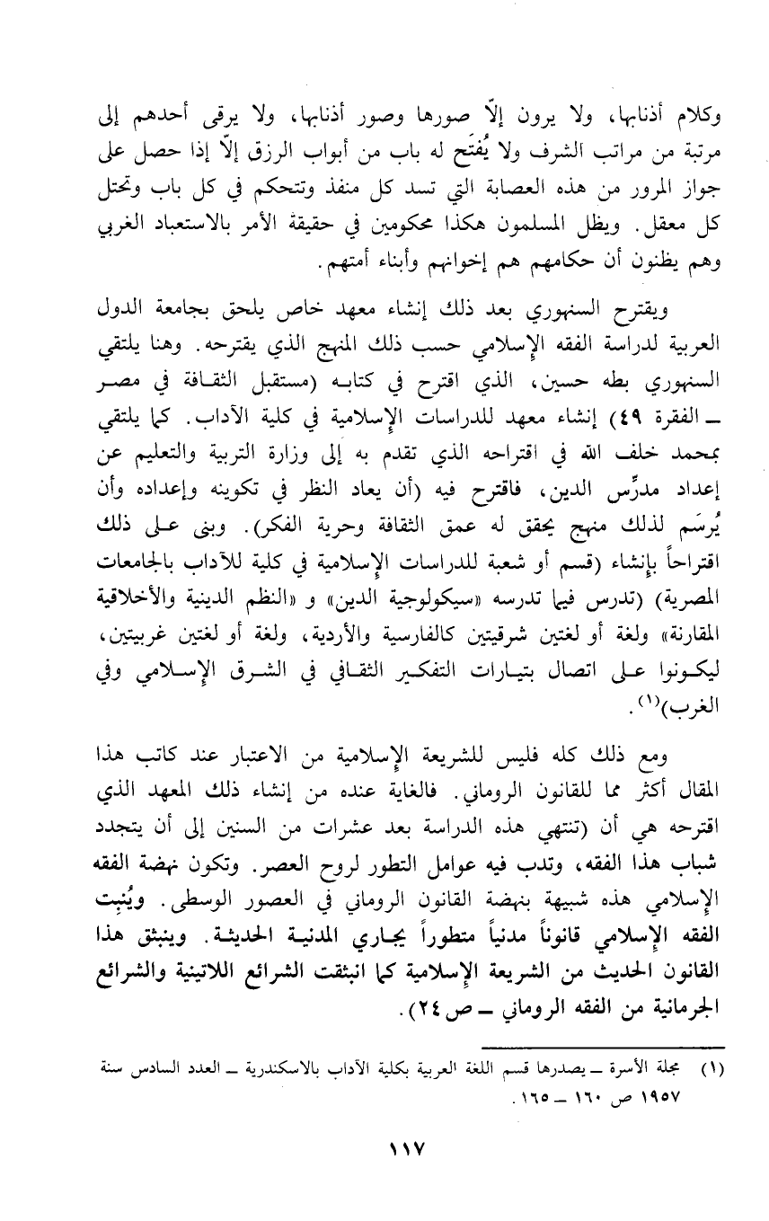 ومع ذلك كله فليس للشريعة الإِسلامية من الاعتبار عند كاتب هذا المقال أكثر مما للقانون الروماني. فالغاية عنده من إنشاء ذلك المعهد الذي اقترحه هي أن (تنتهي هذه الدراسة بعد عشرات من السنين إلى أن يتجدد شباب هذا الفقه، وتدب فيه عوامل التطور لروح العصر. وتكون نهضة الفقه الإِسلامي هذه شبيهة بنهضة القانون الروماني في العصور الوسطى. ويُنبِت الفقه الإِسلامي قانوناً مدنياً متطوراً يجاري المدنية الحديثة. وينبثق هذا القانون الحديث من الشريعة الإِسلامية كما انبثقت الشرائع اللاتينية والشرائع الجرمانية من الفقه الروماني - ص 24).