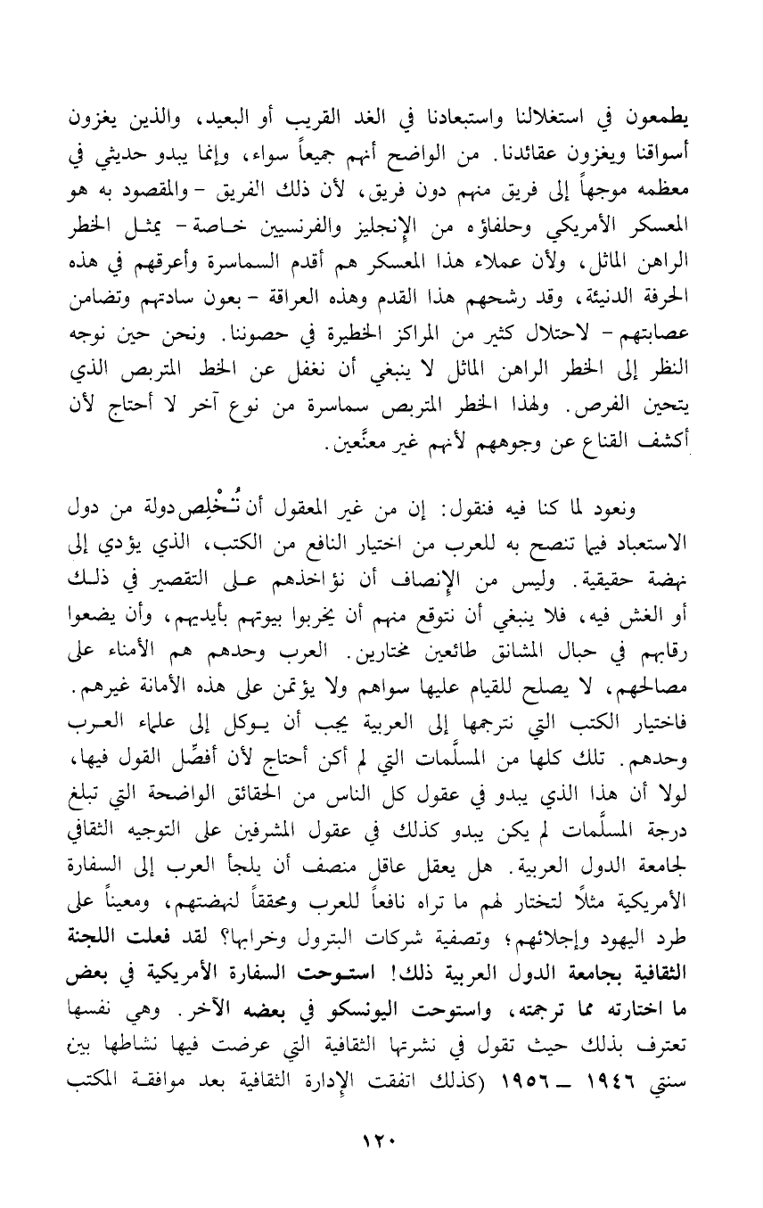 ونعود لما كنا فيه فنقول: إن من غير المعقول أن تُخْلِص دولة من دول الاستعباد فيما تنصح به للعرب من اختيار النافع من الكتب، الذي يؤدي إلى نهضة حقيقية. وليس من الإِنصاف أن نؤاخذهم على التقصير في ذلك أو الغش فيه، فلا ينبغىِ أن نتوقع منهم أن يخربوا بيوتهم بأيديهم، وأن يضعوا رقابهم في حبال المشانق طائعين مختارين. العرب وحدهم هم الأمناء على مصالحهم، لا يصلح للقيام عليها سواهم ولا يؤتمن على هذه الأمانة غيرهم. فاختيار الكتب التي نترجمها إلى العربية يجب أن يوكل إلى علماء العرب وحدهم. تلك كلها من المسلَّمات التي لم أكن أحتاج لأن أفصِّل القول فيها، لولا أن هذا الذي يبدو في عقول كل الناس من الحقائق الواضحة التي تبلغ درجة المسلَّمات لم يكن يبدو كذلك في عقول المشرفين على التوجيه الثقافي لجامعة الدول العربية. هل يعقل عاقل منصف أن يلجأ العرب إلى السفارة الأمريكية مثلاً لتختار لهم ما تراه نافعاً للعرب ومحققاً لنهضتهم، ومعيناً على طرد اليهود وإجلائهم؛ وتصفية شركات البترول وخرابها؟ لقد فعلت اللجنة الثقافية بجامعة الدول العربية ذلك! استوحت السفارة الأمريكية في بعض ما اختارته مما ترجمته، واستوحت اليونسكو في بعضه الآخر. وهي نفسها تعترف بذلك حيث تقول في نشرتها الثقافية التي عرضت فيها نشاطها بين سنتي 1946 - 1956) كذلك أتفقت الِإدارة الثقافية بعد موافقة المكتب