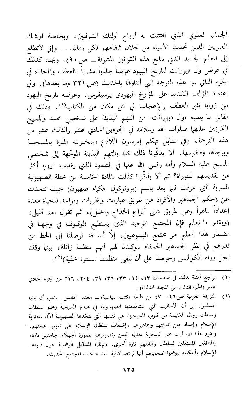 الجمال العلوي الذي افتتنت به أرواح أولئك الشرقيين، وبخاصة أولئك العبريين الذين تحدث الأنبياء من خلال شفاههم لكل زمان ... وإني لأتطلع إلى المعلم الجديد الذي يتابع هذه القوانين المشرقة - ص 90). ويجده كذلك في عرض ول ديورانت لتاريخ اليهود عرضاً جذاباً مشرباً بالعطف والمحاباة في الجزء الثاني من هذه الترجمة التي أتناولها بالحديث (ص 321 وما بعدها)، وفي اعتماد المؤلف الشديد على المؤرخ اليهودي يوسيفوس، وعرضه تاريخ اليهود من زوايا تثير العطف والإِعجاب في كل مكان من الكتاب (¬1). وذلك في مقابل ما يصبه "ول ديورانت" من التهم البذيئة على شخصي مُحَمَّدْ والمسيح الكريمين عليهما صلوات الله وسلامه في الجزءين الحادي عشر والثالث عشر من هذه الترجمة، وفي مقابل تهكم إمرسون اللاذع وسخريته المرة بالمسيحية وبرجالها وطقوسها. ألا يذكّرنا ذلك كله بالتهم البذيئة الموجّهة إلى شخصي المسيح عليه السلام وأمه رضي الله عنها في التلمود الذي يقدسه اليهود أكثر من تقديسهم للتوراة, ثم ألا يذكّرنا كذلك بالمادة الخامسة من خطة الصهيونية السرية التي عرفت فيما بعد باسم (بروتوكول حكماء صهيون) حيث تتحدث عن (حكم الجماهير والأفراد عن طريق عبارات ونظريات وقواعد للحياة معدة إعداداً ماهراً وعن طريق شتى أنواع الخداع والحيل)، ثم تقول بعد قليل: (وبقدر ما نعلم فإِن المجتمع الوحيد الذي يستطيع الوقوف في وجهنا في مضمار هذا العلم هو مجتمع اليسوعيين، إلَّا أننا قد توصلنا إلى الحط من قدرهم في نظر الجماهير الحمقاء بتوكيدنا لهم أنهم منظمة زائلة، بينما وقفنا نحن وراء الكواليس وحرصنا على أن تبقى منظمتنا مستترة خفية) (¬2).