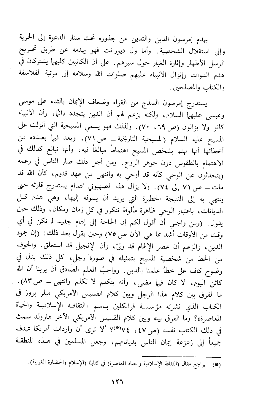 يستدرج إمرسون السذج من القراء وضعاف الإِيمان بالثناء على موسى وعيسى عليهما السلام، ولكنه يزعم لهم أن الدين يتجدد دائمًا، وأن الأنبياء كانوا ولا يزالون (ص 69، 70). ولذلك فهو يسمي المسيحية التي أنزلت على المسيح عليه السلام (المسيحية التاريخية - ص 71)، ويعد فيما يعدده من أخطائها أنها تهتم بشخص المسيح اهتماماً مبالغاً فيه، وأنها تبالغ كذلك في الاهتمام بالطقوس دون جوهر الروح. ومن أجل ذلك صار الناس في زعمه (يتحدثون عن الوحي كأنه قد أوحي به وانتهى من عهد قديم، كأن الله قد مات - ص 71 إلى 74). ولا يزال هذا الصهيوني الهدام يستدرج قارئه حتى ينتهي به إلى النتيجة الخطيرة التي يريد أن يسوقه إليها، وهي هدم كل الديانات، باعتبار الوحي ظاهرة مألوفة تتكرر في كل زمان ومكان، وذلك حين يقول: (ومن واجبي أن أقول لكم إن الحاجة إلى إلهام جديد لم تكن في أي وقت من الأوقات أشد مما هي الآن ص 75) وحين يقول بعد ذلك: (إن جمود الدين، والزعم أن عصر الإِلهام قد ولىّ، وأن الإِنجيل قد استغلق، والخوف من الحط من شخصية المسيح بتمثيله في صورة رجل، كل ذلك يدل في وضوح كاف على خطأ علمنا بالدين. وواجبُ العلم الصادق أن يرينا أن الله كائن اليوم، لا كان فيما مضى، وأنه يتكلم لا تكلم وانتهى- ص 83). ما الفرق بين كلام هذا الرجل وبين كلام القسيس الأمريكي ميلر بروز في الكتاب الذي نشرته مؤسسة فرانكلين باسم "الثقافة الإِسلامية والحياة المعاصرة"؟ وما الفرق بينه وبين كلام القسيس الأمريكي الآخر هارولد سمث في ذلك الكتاب نفسه (ص 47، 74 (*)؟ ألا ترى أن واردات أمريكا تهدف جميعاً إلى زعزعة إيمان الناس بدياناتهم، وجعل المسلمين في هذه المنطقة