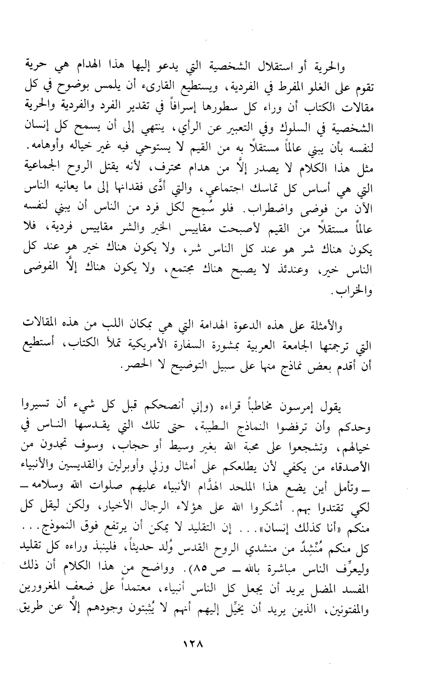 والحرية أو استقلال الشخصية التي يدعو إليها هذا الهدام هي حرية تقوم على الغلو المفرط في الفردية، ويستطيع القارئ أن يلمس بوضوح في كل مقالات الكتاب أن وراء كل سطورها إسرافاً في تقدير الفرد والفردية والحرية الشخصية في السلوك وفي التعبير عن الرأي، ينتهي إلى أن يسمح كل إنسان لنفسه بأن يبني عالماً مستقلاً به من القيم لا يستوحي فيه غير خياله وأوهامه. مثل هذا الكلام لا يصدر إلَّا من هدام محترف, لأنه يقتل الروح الجماعية التي هي أساس كل تماسك اجتماعي، والتي أدَّى فقدانها إلى ما يعانيه الناس الآن من فوضى واضطراب. فلو سُمِح لكل فرد من الناس أن يبني لنفسه عالماً مستقلاً من القيم لأصبحت مقاييس الخير والشر مقاييس فردية، فلا يكون هناك شر هو عند كل الناس شر، ولا يكون هناك خير هو عند كل الناس خير، وعندئذ لا يصبح هناك مجتمع، ولا يكون هناك إلَّا الفوضى والخراب.