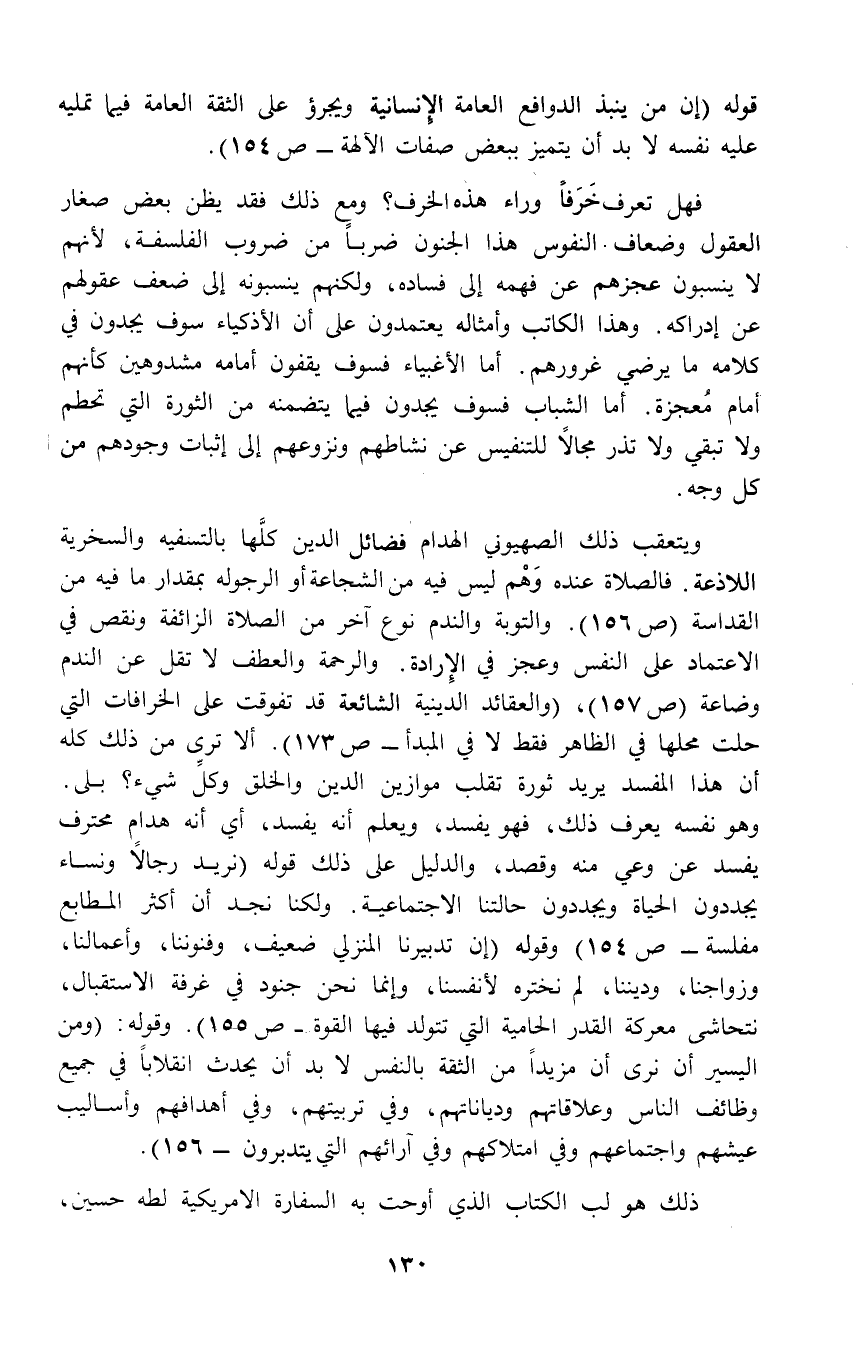 ويتعقب ذلك الصهيوني الهدام فضائل الدين كلَّها بالتسفيه والسخرية اللاذعة. فالصلاة عنده وَهْم ليس فيه من الشجاعة أو الرجوله بمقدار ما فيه من القداسة (ص 156). والتوبة والندم نوع آخر من الصلاة الزائفة ونقص في الاعتماد على النفس وعجز في الإِرادة. والرحمة والعطف لا تقل عن الندم وضاعة (ص 157)، (والعقائد الدينية الشائعة قد تفوقت على الخرافات التي حلت محلها في الظاهر فقط لا في المبدأ- ص 173). ألا ترى من ذلك كله أن هذا المفسد يريد ثورة تقلب موازين الدين والخلق وكلَّ شيء؟ بلى. وهو نفسه يعرف ذلك، فهو يفسد، ويعلم أنه يفسد، أي أنه هدام محترف يفسد عن وعي منه وقصد، والدليل على ذلك قوله (نريد رجالاً ونساء يجددون الحياة ويجددون حالتنا الاجتماعية. ولكنا نجد أن أكثر المطابع مفلسة - ص 154) وقوله (إن تدبيرنا المنزلي ضعيف، وفنوننا، وأعمالنا، وزواجنا، وديننا، لم نختره لأنفسنا، وإنما نحن جنود في غرفة الاستقبال، نتحاشى معركة القدر الحامية التي تتولد فيها القوة - ص 155). وقوله. (ومن اليسير أن نرى أن مزيداً من الثقة بالنفس لا بد أن يحدث انقلاباً في جميع وظائف الناس وعلاقاتهم ودياناتهم، وفي تربيتهم، وفي أهدافهم وأساليب عيشهم واجتماعهم وفي امتلاكهم وفي آرائهم التي يتدبرون - 156).