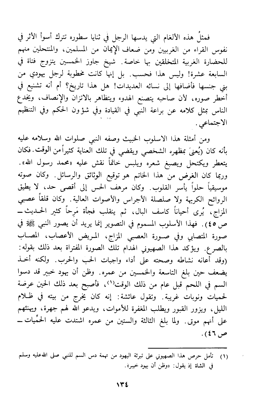 ومن أمثلة هذا الاسلوب الخبيث وصفه النبي صلوات الله وسلامه عليه بأنه كان (يُعنىَ بمظهرد الشخصي ويقضي في تلك العناية كثيراً من الوقت. فكان يتعطر ويكتحل ويصبغ شعره ويلبس خاتماً نقش عليه "مُحَمَّدْ رسول الله". وربما كان الغرض من هذا الخاتم هو توقيع الوثائق والرسائل. وكان صوته موسيقياً حلواً يأسر القلوب. وكان مرهف الحس إلى أقصى حد، لا يطيق الروائح الكريهة ولا صلصلة الأجراس والأصوات العالية. وكان قلقاً عصبي المزاج، يُرى أحياناً كاسف البال، ثم ينقلب فجأة مَرِحاً كثير الحديث - ص 45). فهذا الأسلوب المسموم في التصوير إنما يريد أن يصور النبي - صلى الله عليه وسلم - في صورة المتصابي وفي صورة العصبي المزاج، المريض الأعصاب، المصاب بالصرع. ويؤكد هذا الصهيوني الهدام تلك الصورة المفتراة بعد ذلك بقوله: (وقد أعانه نشاطه وصحته على أداء واجبات الحب والحرب. ولكنه أخذ يضعف حين بلغ التاسعة والخمسين من عمره. وظن أن يهود خبير قد دسوا السم في اللحم قبل عام من ذلك الوقت (¬1)، فأصبح بعد ذلك الحين عرضة لحميات ونوبات غريبة. وتقول عائشة: إنه كان يخرج من بيته في ظلام الليل، ويزور القبور ويطلب المغفرة للأموات، ويدعو الله لهم جهرة، ويهنئهم على أنهم موتى. ولما بلغ الثالثة والستين من عمره اشتدت عليه الحمِّيات - ص 46).