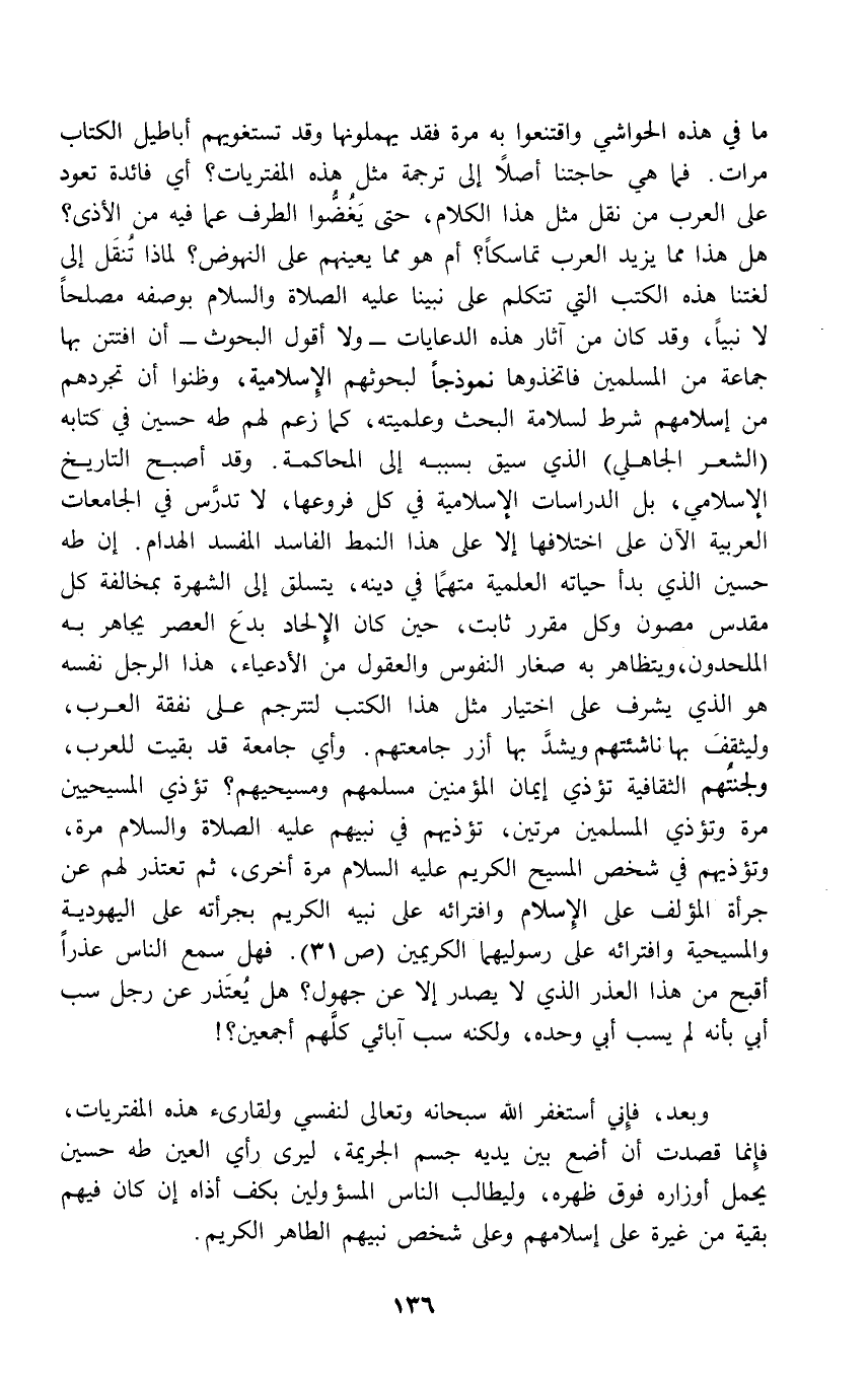 وبعد، فإِني أستغفر الله سبحانه وتعالى لنفسي ولقارىء هذه المفتريات، فإِنما قصدت أن أضع بين يديه جسم الجريمة، ليرى رأي العين طه حسين يحمل أوزاره فوق ظهره، وليطالب الناس المسؤولين بكف أذاه إن كان فيهم بقية من غيرة على إسلامهم وعلى شخص نبيهم الطاهر الكريم.