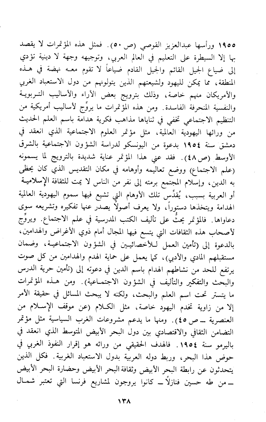 1955 ورأسها عبد العزيز القوصي (ص50). فمثل هذه المؤتمرات لا يقصد بها إلا السيطرة على التعليم في العالم العربي، وتوجيهه وجهة لا دينية تؤدي إلى ضياع الجيل القائم والجيل القادم ضياعاً لا تقوم معه نهضة في هذه المنطقة، مما يمكن لليهود ولشيعتهم الذين يتولونهم من دول الاستعباد الغربي والأمريكان منهم خاصة، وذلك بترويج بعض الآراء والأساليب التربوية والنفسية المنحرفة الفاسدة. ومن هذه المؤتمرات ما يروِّج لأساليب أمريكية من التنظيم الاجتماعي تخفي في ثناياها مذاهب فكرية هدامة باسم العلم الحديث من ورائها اليهودية العالمية، مثل مؤتمر العلوم الاجتماعية الذي انعقد في دمشق سنة 1954 بدعوة من اليونسكو لدراسة الشؤون الاجتماعية بالشرق الأوسط (ص 48). فقد عني هذا المؤتمر عناية شديدة بالترويج لما يسمونه (علم الاجتماع) ووضع تعاليمه وأوهامه في مكان التقديس الذي كان يحظى به الدين، وإسلام المجتمع برمته إلى نفر من الناس لا يمت للثقافة الإِسلامية أو العربية بسبب، يُقدِّس تلك الأوهام التِي تشيع فيها سموم اليهودية العالية الهدامة ويتخذها دستوراً، ولا يعرف أصولاً يصدر عنها تفكيره وتشريعه سوى دعاواها. فالمؤتمر يحثُّ على تأليف الكتب المدرسية في علم الاجتماع. ويروِّج لأصحاب هذه الثقافات التي يتسع فيها المجال أمام ذوي الأغراض والهدامين، بالدعوة إلى (تأمين العمل للأخصائيين في الشؤون الاجتماعية، وضمان مستقبلهم المادي والأدبي)، كما يعمل على حماية الهدم والهدامين من كل صوت يرتفع للحد من نشاطهم الهدام باسم الدين في دعوته إلى (تأمين حرية الدرس والبحث والتفكير والتأليف في الشؤون الاجتماعية). ومن هذه الؤتمرات ما يتستر تحت اسم العلم والبحث، ولكنه لا يبحث المسائل في حقيقة الأمر إلا من زاوية تخدم اليهود خاصة، مثل الكلام (عن موقف الإِسلام من العنصرية - ص 45). ومنها ما يدعم مشروعات الغرب السياسية مثل مؤتمر التضامن الثقافي والاقتصادي بين دول البحر الأبيض المتوسط الذي انعقد في باليرمو سنة 1954. فالهدف الحقيقي من ورائه هو إقرار النفوذ الغربي في حوض هذا البحر، وربط دوله العربية بدول الاستعباد الغربية. فكل الذين يتحدثون عن رابطة البحر الأبيض وثقافة البحر الأبيض وحضارة البحر الأبيض - من طه حسين فنازلاً - كانوا يروجون لمشاريع فرنسا التي تعتبر شمال