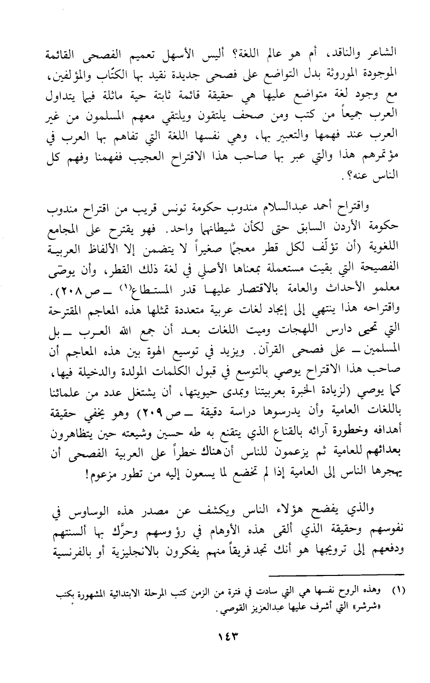 الشاعر والناقد، أم هو عالم اللغة؟ أليس الأسهل تعميم الفصحى القائمة الموجودة الموروثة بدل التواضع على فصحى جديدة نقيد بها الكتّاب والمؤلفين، مع وجود لغة متواضع عليها هي حقيقة قائمة ثابتة حية ماثلة فيما يتداول العرب جميعاً من كتب ومن صحف يلتقون ويلتقي معهم المسلمون من غير العرب عند فهمها والتعبير بها، وهي نفسها اللغة التي تفاهم بها العرب في مؤتمرهم هذا والتي عبر بها صاحب هذا الاقتراح العجيب ففهمنا وفهم كل الناس عنه؟.
