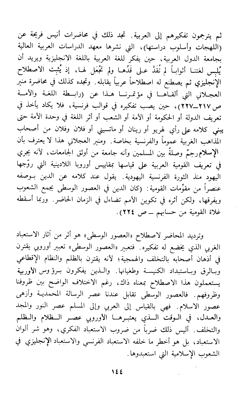 وترديد المحاضر لاصطلاح "العصور الوسطى" هو أثر من آثار الاستعباد الغربي الذي يخضع له تفكيره. فتعبير "العصور الوسطى" تعبير أوروبي يقترن في أذهان أصحابه بالتخلف والهمجية؛ لأنه يقترن بالظلم والنظام الإِقطاعي وبالرق وباستبداد الكنيسة وطغيانها. والذين يفكرون برؤوس الأوربية يستعملون هذا الاصطلاح بمعناه ذاك، رغم الاختلاف الواضح بين ظروفنا وظروفهم. فالعصور الوسطى تقابل عندنا عصر الرسالة المحمدية وأزهى عصور الإِسلام. فهي بالقياس إلى العربي وإلى المسلم عصر النور والمجد والعدل، في الوقت الذي يعتبرها الأوروبي عصر الظلام والظلم والتخلف. أليس ذلك ضرباً من ضروب الاستعباد الفكري، وهو شر ألوان الاستعباد، بل هو أخطر ما خلفه الاستعباد الفرنسي والاستعباد الإِنجليزي في الشعوب الإِسلامية التي استعبدوها.