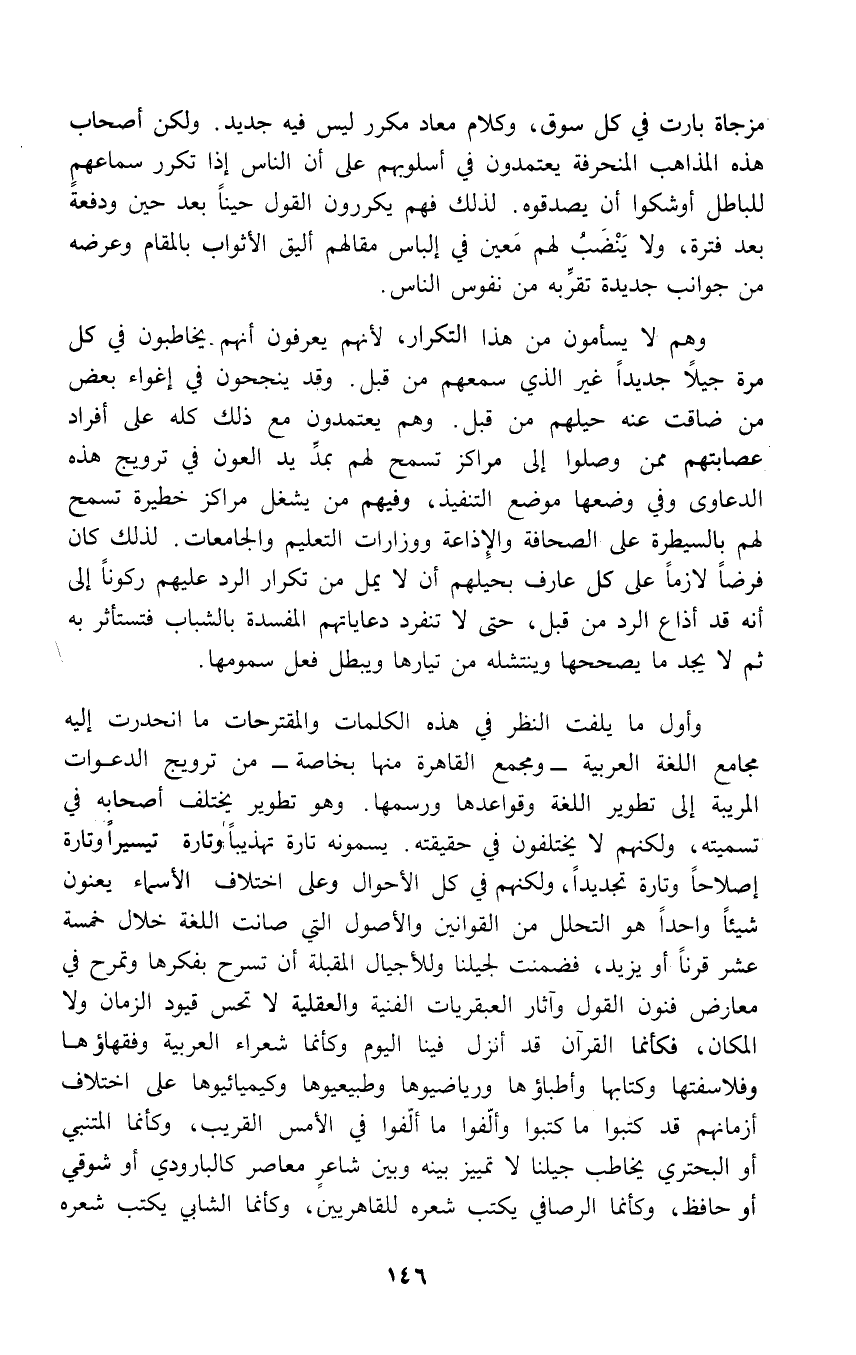 وأول ما يلفت النظر في هذه الكلمات والمقترحات ما أنحدرت إليه مجامع اللغة العربية - ومجمع القاهرة منها بخاصة - من ترويج الدعوات المريبة إلى تطوير اللغة وقواعدها ورسمها. وهو تطوير يختلف أصحابه في تسميته، ولكنهم لا يختلفون في حقيقته. يسمون تارة تهذيباً وتارة تيسيراً وتارة إصلاحاً وتارة تجديداً، ولكنهم في كل الأحوال وعلى اختلاف الأسماء يعنون شيئاً واحداً هو التحلل من القوانين والأصول التي صانت اللغة خلال خمسة عشر قرناً أو يزيد، فضمنت لجيلنا وللأجيال القبلة أن تسرح بفكرها وتمرح في معارض فنون القول وآثار العبقريات الفنية والعقلية لا تحس قيود الزمان ولا المكان، فكأنما القرآن قد أنزل فينا اليوم وكأنما شعراء العربية وفقهاؤها وفلاسفتها وكتابها وأطباؤها ورياضيوها وطبيعيوها وكيميائيوها على اختلاف أزمانهم قد كتبوا ما كتبوا وألّفوا ما ألّفوا في الأمس القريب، وكأنما المتنبي أو البحتري يخاطب جيلنا لا تمييز بينه وبين شاعرٍ معاصر كالبارودي أو شوقي أو حافظ، وكأنما الرصافي يكتب شعره للقاهريين، وكأنما الشابي يكتب شعره