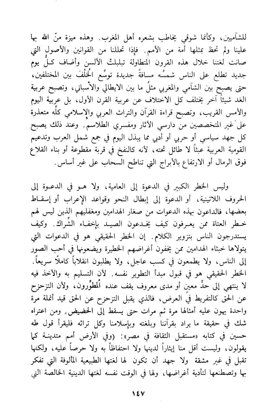 للشآميين، وكأنما شوقي يخاطب بشعره أهل المغرب. وهذه ميزة منّ الله بها علينا ولم تحظ بمثلها أمة من الأمم. فإِذا تحللنا من القوانين والأصول التي صانت لغتنا خلال هذه القرون المتطاولة تبلبلتْ الألسن وأضاف كلُّ يوم جديد تطلع على الناس شمسُه مسافةً جديدة توسِّع الخُلْفَ بين المختلفين، حتى يصبح بين الشآمي والمغربي مثلُ ما بين الايطالي والأسباني، وتصبح عربية الغد شيئاً آخر يختلف كل الاختلاف عن عربية القرن الأول، بل عربية اليوم والأمس القريب، وتصبح قراءة القرآن والتراث العربي والإِسلامي كلِّه متعذرة على غير المتخصصين من دارسي الآثار ومفسري الطلاسم. وعند ذلك يصبح كل جهد سياسي أو حربي أو أدبي مما يبذل اليوم في جمع شمل العرب وتدعيم القومية العربية عبثاً لا طائل تحته, لأنه كالنفخ في قربة مقطوعة أو بناء القلاع فوق الرمال أو الارتفاع بالأبراج التي تناطح السحاب على غير أساس.