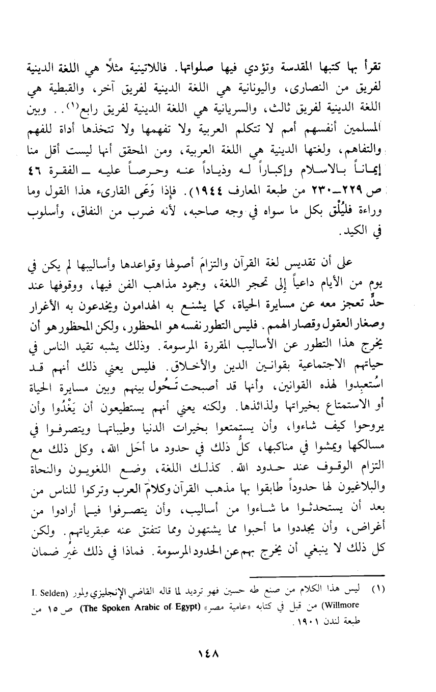 (¬1) ليس هذا الكلام من صنع طه حسين فهو ترديد لما قاله القاضي الإِنجليزي ولمور (1. Selden Willmore) من قبل في كتابه "عامية مصر" (The Spoken Arabic of Egypt) ص 15 من طبعة لندن 1901.
