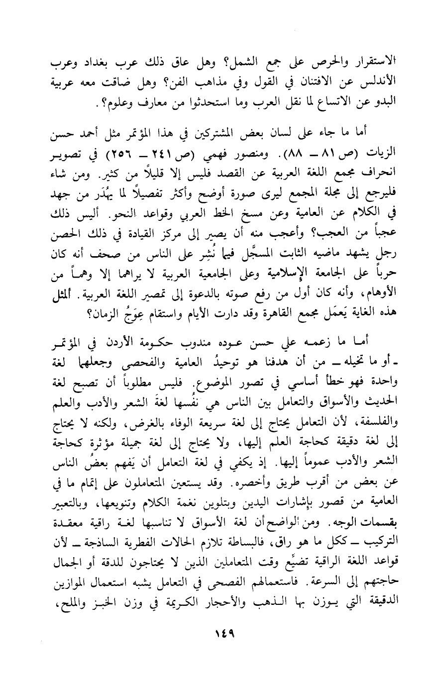 أما ما جاء على لسان بعض المشتركين في هذا المؤتمر مثل أحمد حسن الزيات (ص 81 - 88). ومنصور فهمي (ص 241 - 256) في تصوير انحراف مجمع اللغة العربية عن القصد فليس إلا قليلاً من كثير. ومن شاء فليرجع إلى مجلة المجمع ليرى صورة أوضح وأكثر تفصيلاً لما يُهدَر من جهد في الكلام عن العامية وعن مسخ الخط العربي وقواعد النحو. أليس ذلك عجباً من العجب؟ وأعجب منه أن يصير إلى مركز القيادة في ذلك الحصن رجل يشهد ماضيه الثابت المسجَّل فيما نُشِر على الناس من صحف أنه كان حرباً على الجامعة الإِسلامية وعلى الجامعية العربية لا يراهما إلا وهماً من الأوهام، وأنه كان أول من رفع صوته بالدعوة إلى تمصير اللغة العربية. ألمثل هذه الغاية يَعمَل مجمع القاهرة وقد دارت الأيام واستقام عِوَجُ الزمان؟