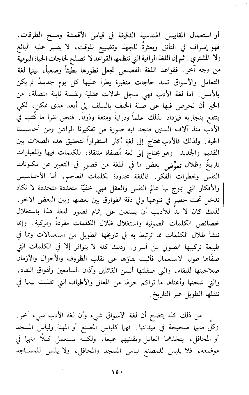 أو استعمال المقاييس الهندسية الدقيقة في قياس الأقمشة ومسح الطرقات، فهو إسراف في التأنق وبعثرةٌ للجهد وتضييع للوقت، لا يصبر عليه البائع ولا المشتري. ثم إن اللغة الراقية التي تنظمها القواعد لا تصلح لحاجات الحياة اليومية من وجه آخر. فقواعد اللغة الفصحى تجعل تطورها بطيئاً وصعباً، بينما لغة التعامل والأسواق تسد حاجات متغيرة يطرأ عليها كل يوم جديد لم يكن بالأمس. أما لغة الأدب فهي سجل لحالات عقلية ونفسية ثابتة متصلة، من الخير أن نحرص فيها على صلة الخلف بالسلف إلى أبعد مدى ممكن، لكي ينتفع بتجاربه فيزداد بذلك علماً ودرايةً ومتعة وذوقاً. فنحن نقرأ ما كتب في الأدب منذ آلاف. السنين فنجد فيه صورة من تفكيرنا الراهن ومن أحاسيسنا الحية. ولذلك فالأدب محتاج إلى لغةٍ أكثر استقراراً لتحقيق هذه الصلات بين القديم والجديد. وهو يحتاج إلى لغة مُصَفاة منتقاة، للكلمات فيها وللعبارات تاريخ وظلال تعوِّض بعض ما في اللغة من قصورٍ في التعبير عن مكنونات النفس وخطرات الفكر. فاللغة محدودة بكلمات المعاجم، أما الأحاسيس والأفكار التي يموج بها عالم النفس والعقل فهي خفيّة متعددة متجددة لا تكاد تدخل تحت حصرٍ في تنوعها وفي دقة الفوارق بين بعضها وبين البعض الآخر. لذلك كان لا بد للأديب أن يستعين على إتمام قصور اللغة هذا باستغلال خصائص الكلمات الصوتية واستغلال ظلال الكلمات مفردةً ومركبة. وإنما تنشأ ظلال الكلمات مما ترتبط به في تاريخها الطويل من استعمالات ومما في طبيعة تركيبها الصوتي من أسرار. وذلك كله لا يتوافر إلا في الكلمات التي صفّاها طول الاستعمال فأثبت بقاؤها على تقلب الظروف والأحوال والأزمان صلاحيتها للبقاء، والتي صقلتها ألسن القائلين وآذان السامعين وأذواق النقاد، والتي شحنها وأغناها ما تراكم حولها من المعاني والأطياف التي تقلبت بينها في تنقلها الطويل عبر التاريخ.