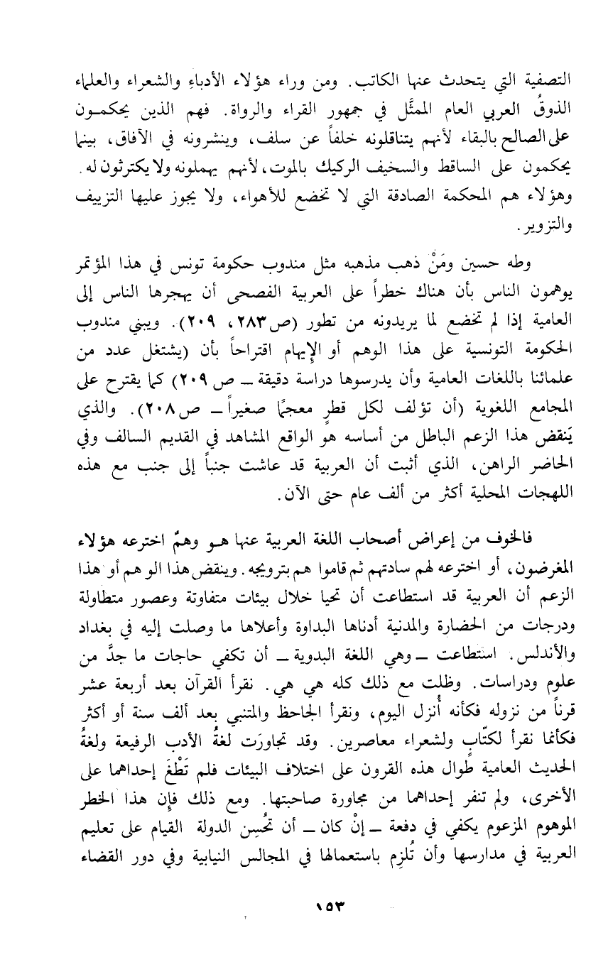 وطه حسين ومَنْ ذهب مذهبه مثل مندوب حكومة تونس في هذا المؤتمر يوهمون الناس بأن هناك خطراً على العربية الفصحى أن يهجرها الناس إلى العامية إذا لم تخضع لما يريدونه من تطور (ص 283، 209). ويبني مندوب الحكومة التونسية على هذا الوهم أو الإِيهام اقتراحاً بأن (يشتغل عدد من علمائنا باللغات العامية وأن يدرسوها دراسة دقيقة - ص 209) كما يقترح على المجامع اللغوية (أن تؤلف لكل قطرٍ معجمًا صغيراً - ص 208). والذي يَنقض هذا الزعم الباطل من أساسه هو الواقع المشاهد في القديم السالف وفي الحاضر الراهن، الذي أثبت أن العربية قد عاشت جنباً إلى جنب مع هذه اللهجات المحلية أكثر من ألف عام حتى الآن.